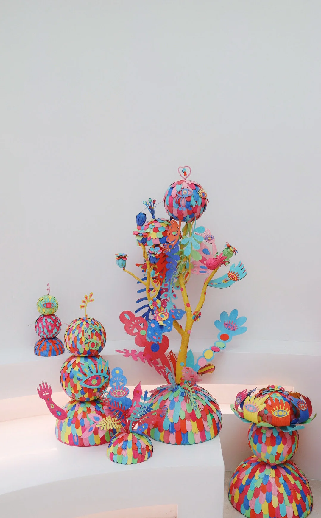 纸张在这片奇遇植物中的表现力上,具有得天独厚的生命力与特征优势。它们吸纳高高低低的色彩,拥抱脱胎于想象力的概念形态,也包容万千材质。一种来自自然的循环对称性因此暗藏其中。