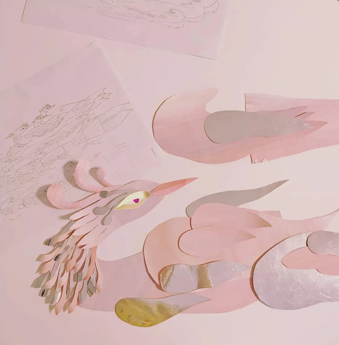 "Phoenix" is also an experiment on paper. A quite large area of the work uses mirror paper, which has a more direct relationship with the space, just like mirrors that replicate. The artist wants the ten phoenixes to be integrated into the installation space. The presence of the audience adds color to the work itself and becomes the temporary skin of them.