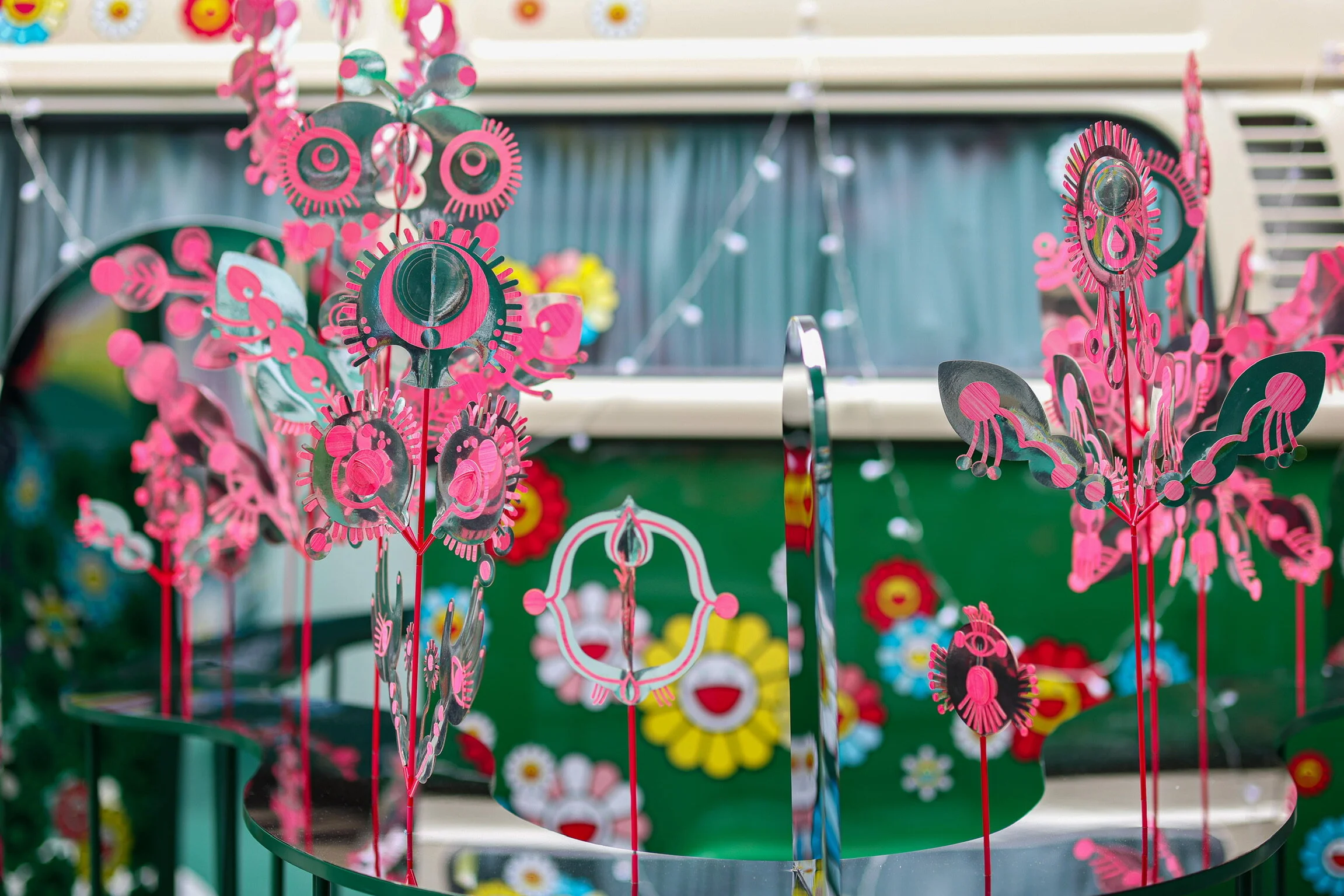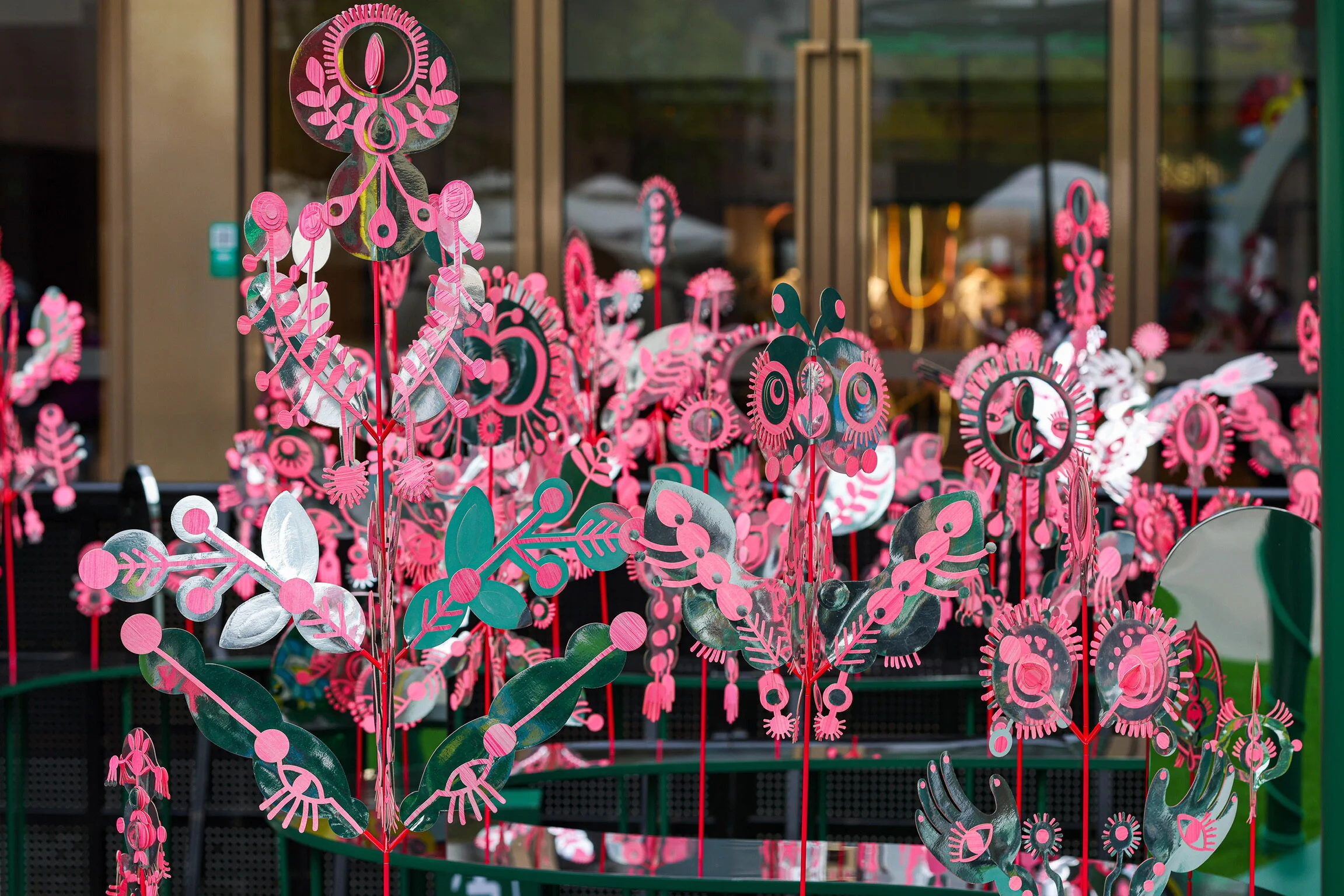 这些植物的生命本质是纸张,一种记载人文温度的自然作物。作品大量使用镜面亮银与荧光粉色,在金属枝干上嫁接粉丸个人标志性的图腾植物“器官”,任由纸张的反射性像光合作用一样将观众也纳入其中,产生对谈。