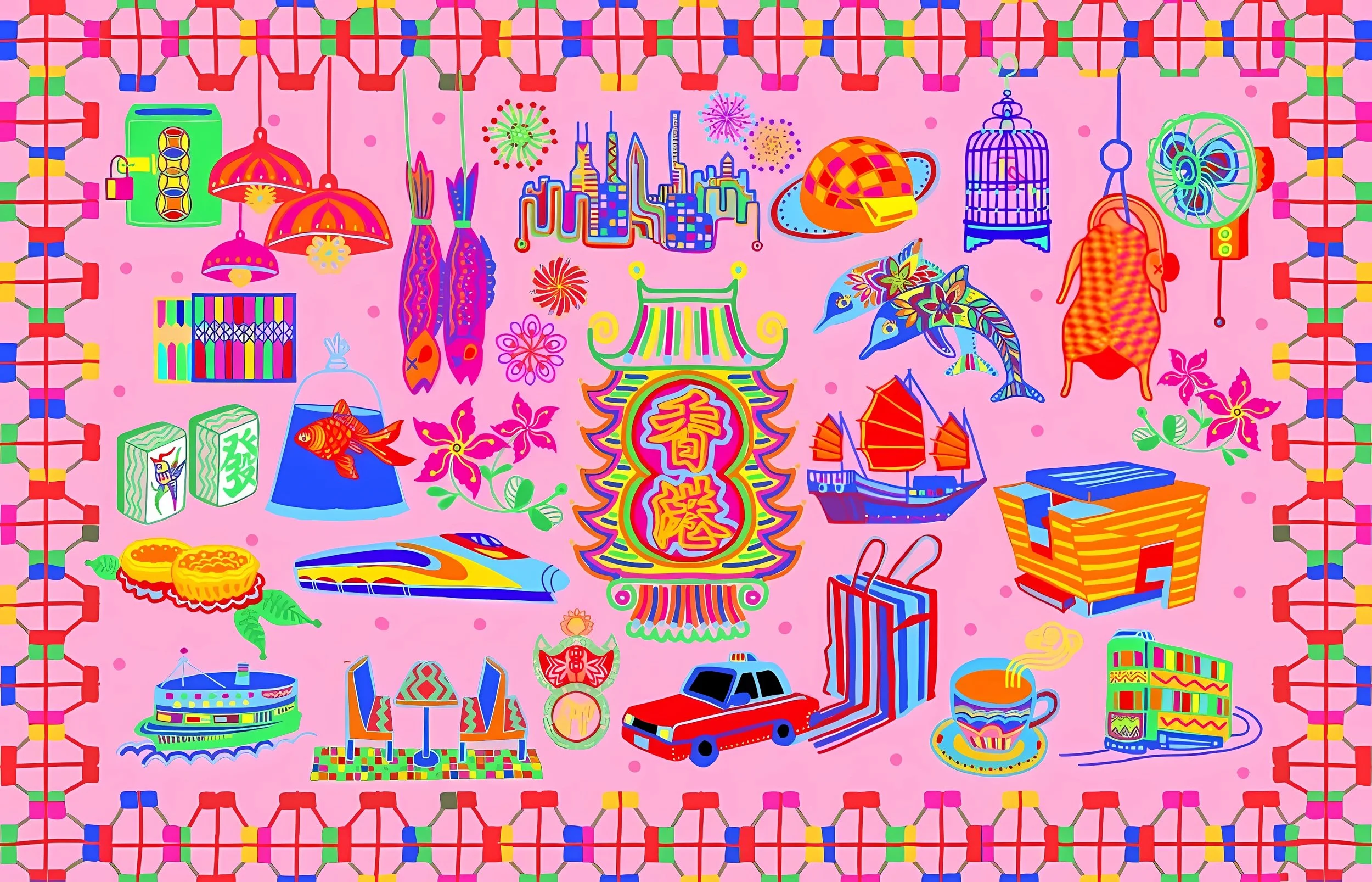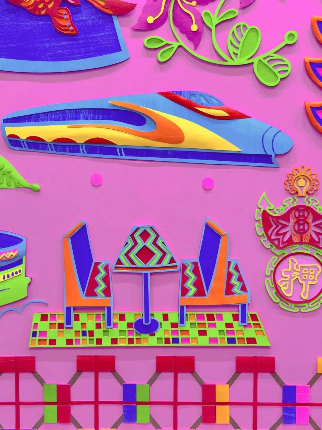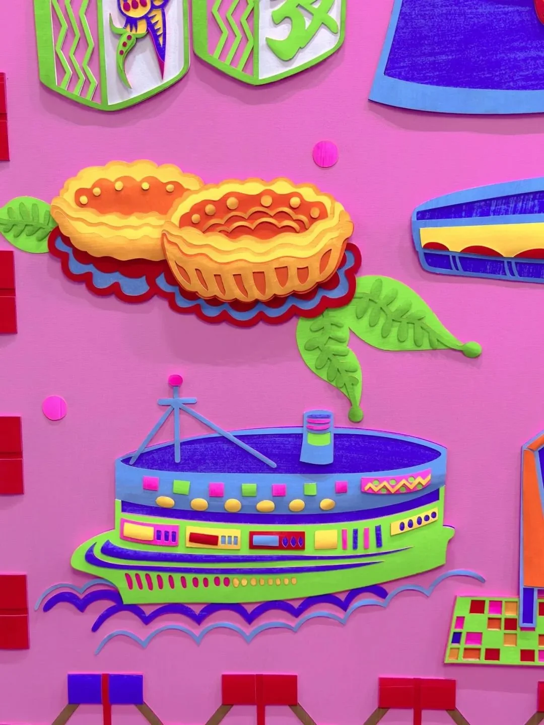 In March, on the shores of Victoria Harbour, Chen presented her maximalist papercutting art, infused with iconic Hong Kong imagery. Drawing from the city's neon signs, tea restaurants' egg tarts and pineapple buns, Star Ferry rides, cross-border trains, and public architecture, she layered signature colors, curves, and intricate compositions to craft a papercut signboard rich with everyday urban elements.