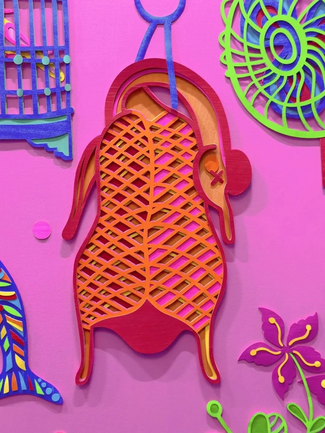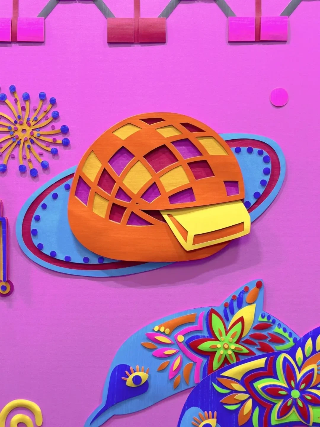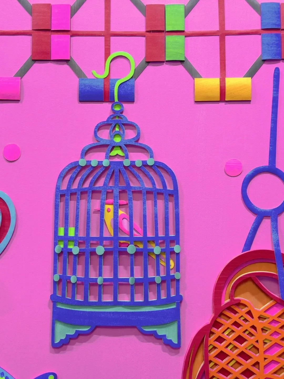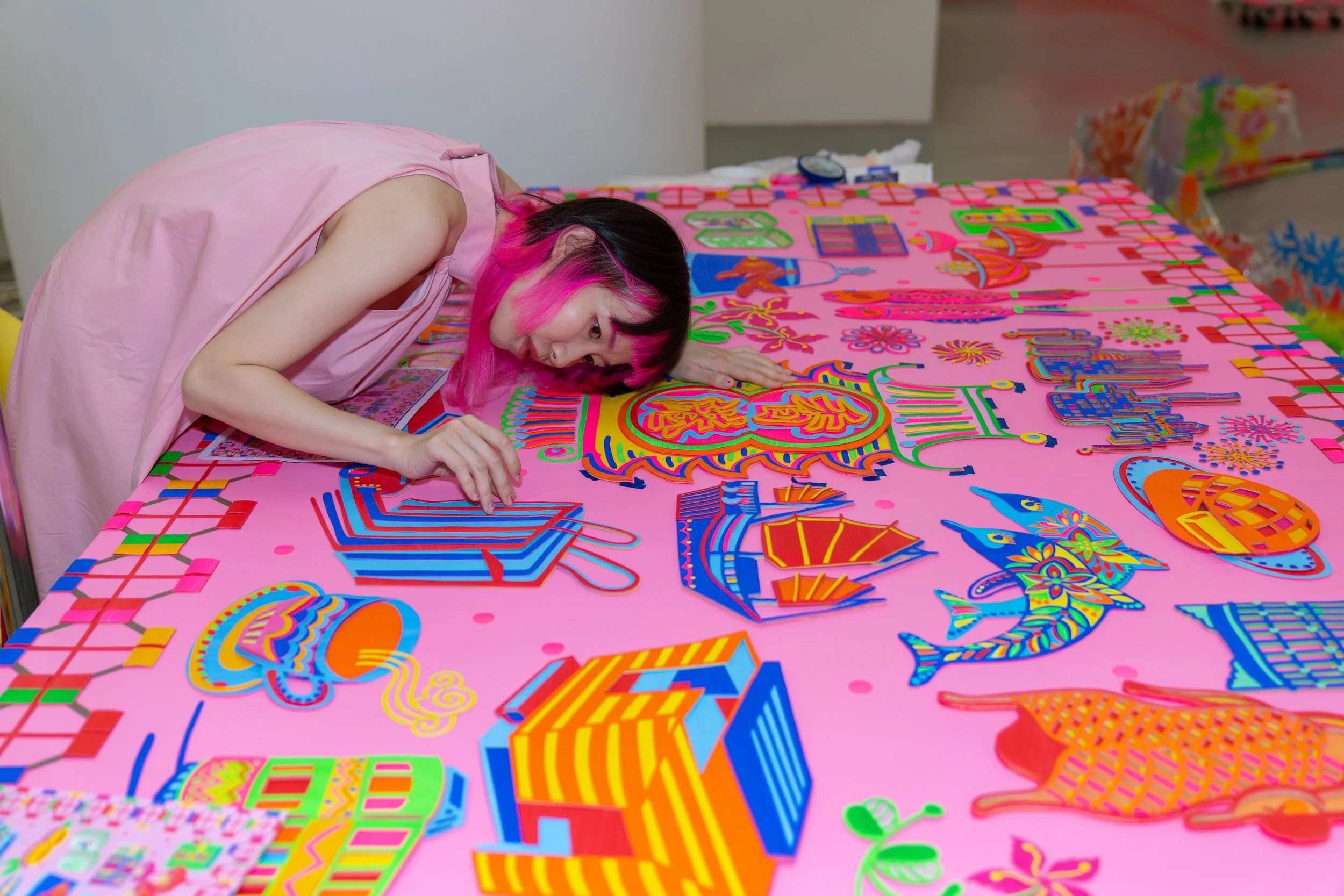 In March, on the shores of Victoria Harbour, Chen presented her maximalist papercutting art, infused with iconic Hong Kong imagery. Drawing from the city's neon signs, tea restaurants' egg tarts and pineapple buns, Star Ferry rides, cross-border trains, and public architecture, she layered signature colors, curves, and intricate compositions to craft a papercut signboard rich with everyday urban elements.