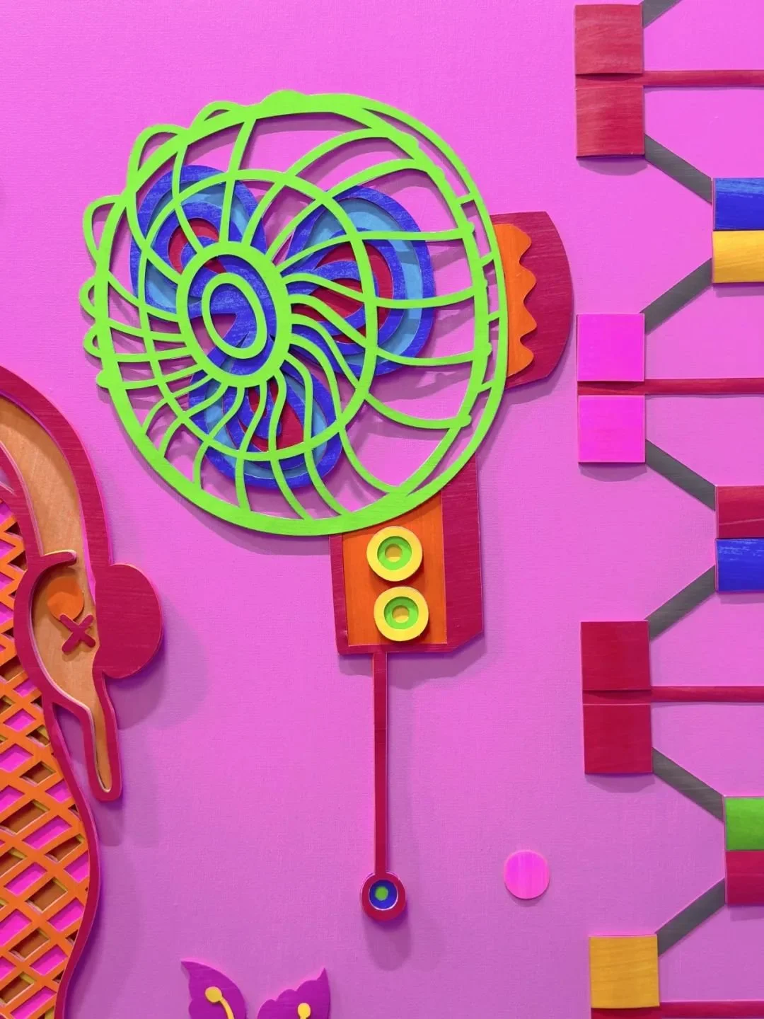 三月维港两岸,从香港白日街头上经典繁复的霓虹招牌,到茶餐厅蛋挞菠萝包、天星渡轮、直通车与公共建筑,她以极繁主义风格组合标志性的色彩,曲线与层次勾勒充满城市日常元素的架上剪纸招牌。