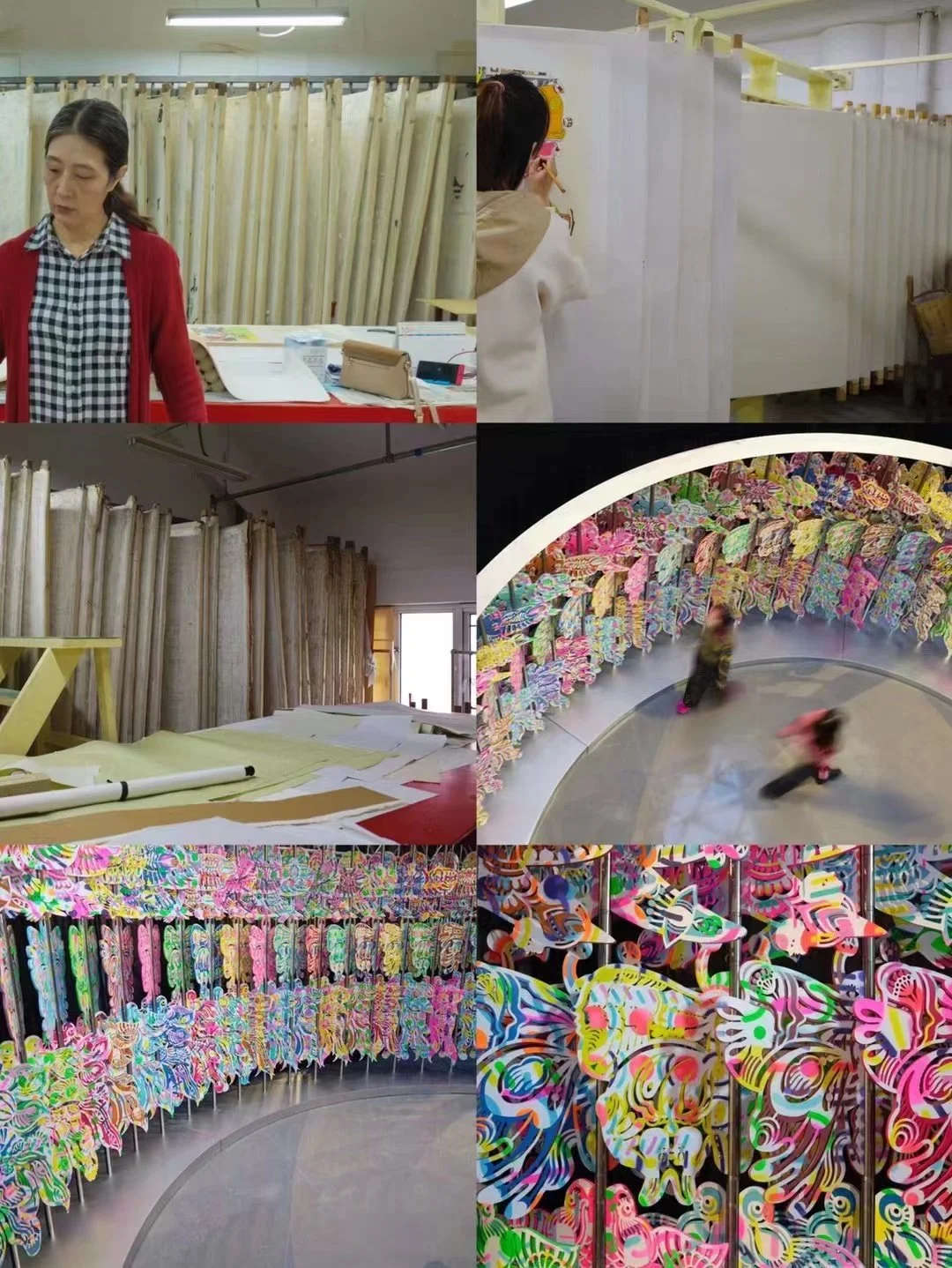 The first is the studios of the Yangliuqing New Year Painting Museum, from which she discovered the "Menzi", a structure that reflects symmetry and workshop attributes. The semi-circle "Menze" structure is grafted into the work, and the flaked totem can also be manually rotated by the audience, making it a breakthrough growth in her series of symmetrical themed works.