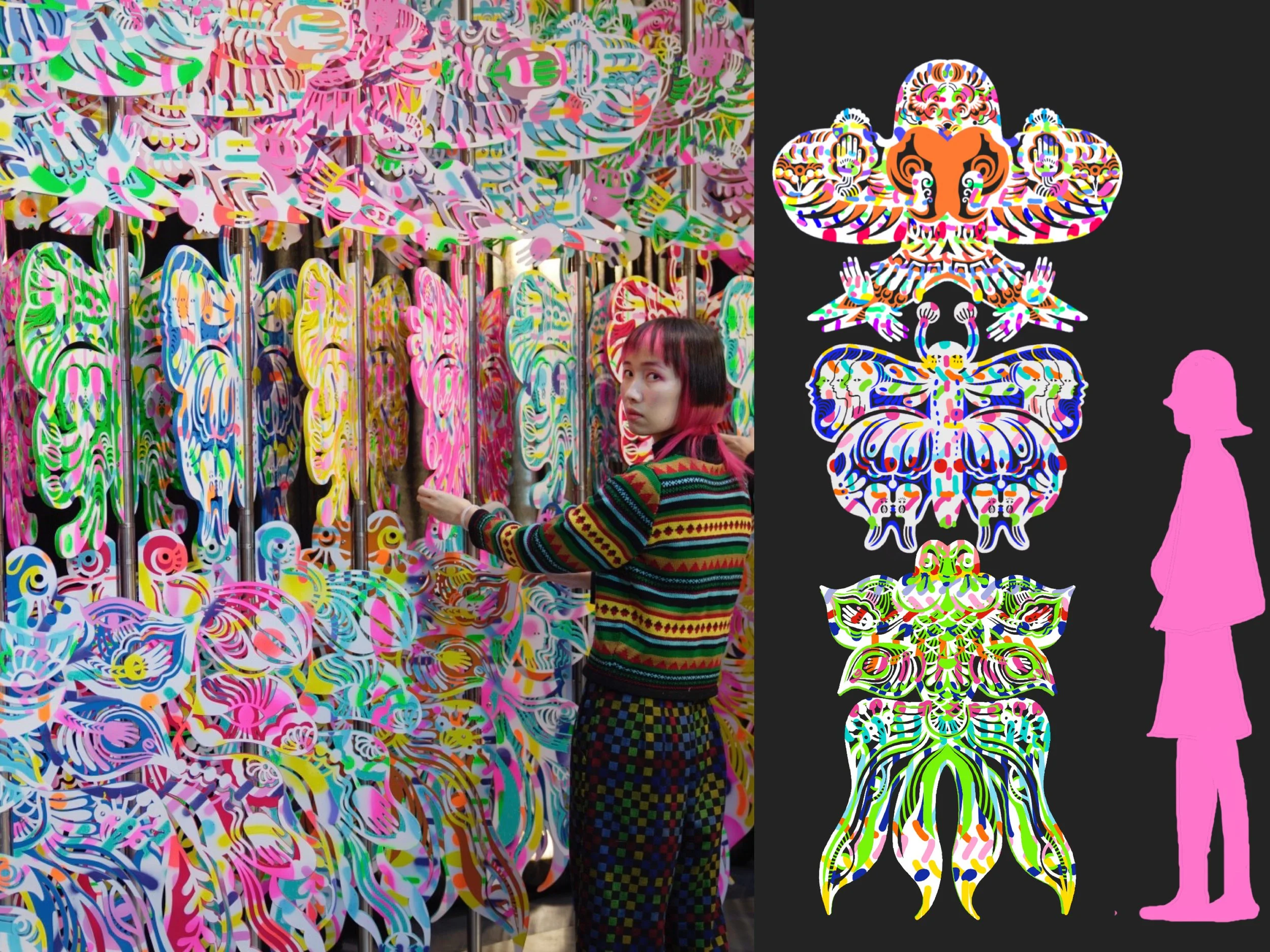 首先是杨柳青年画博物馆的各个工作室,从中她发现了“门子”这个能体现对称和作坊属性的结构。将半圆的“门子”结构嫁接到作品中,片状的图腾同样可以被观众手动转动,成为粉丸一系列对称主题作品中,一次突破性的成长。