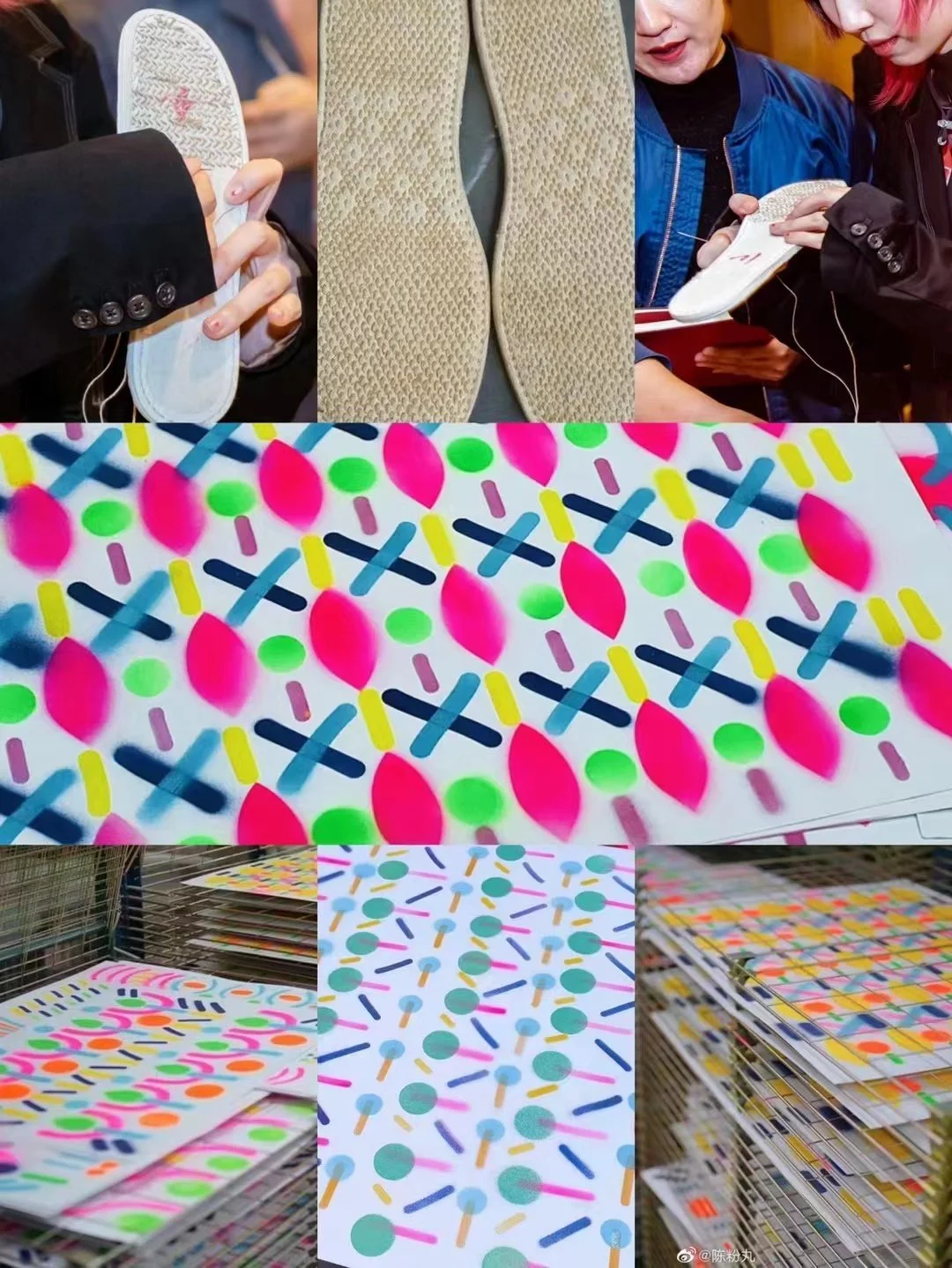 最后是老美华布鞋,在纳鞋底的手艺里,针脚的序列感和对称性出其不意地触动了粉丸。她将这些纹理类似地以自己更为惯用、高饱和度的方式,转化在了纸张之上。