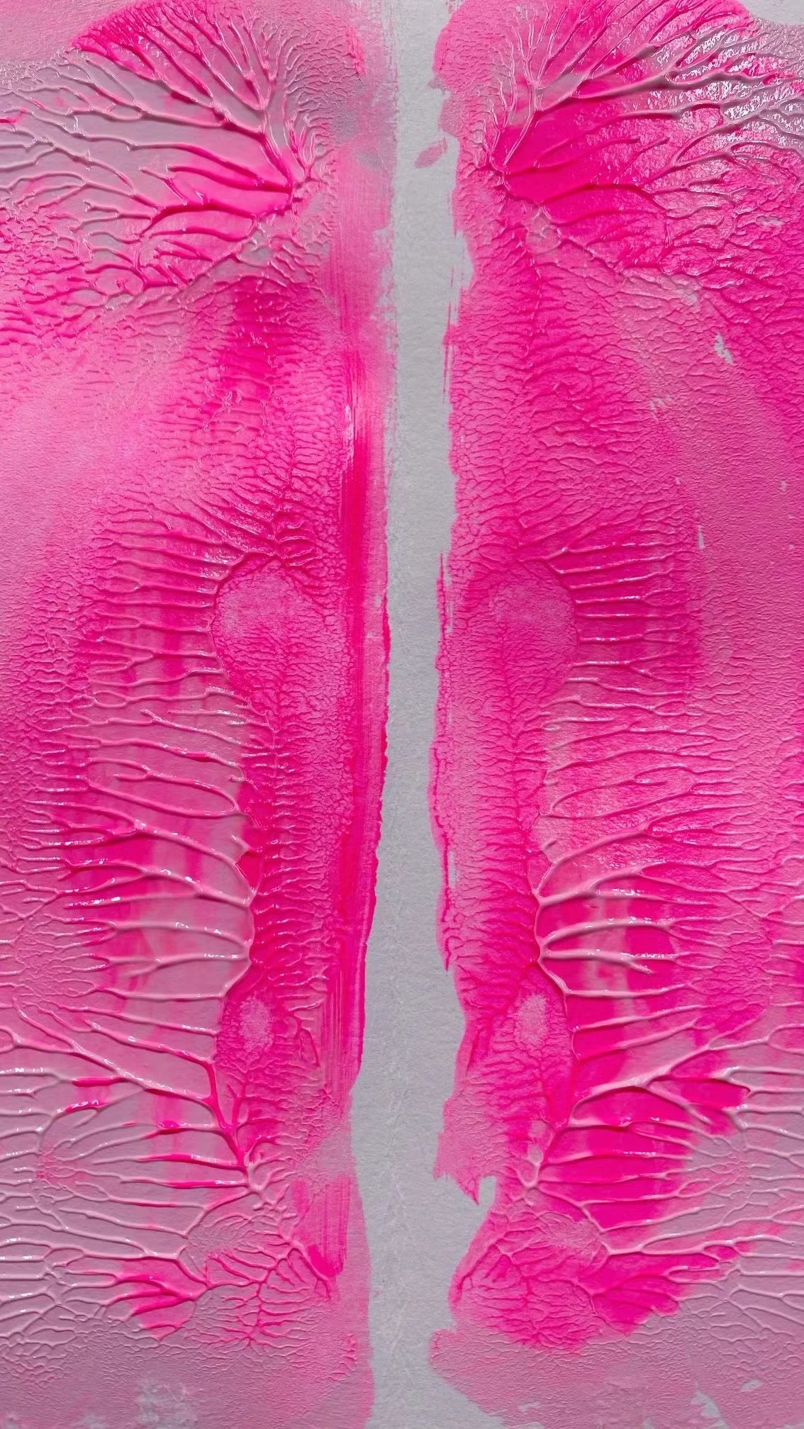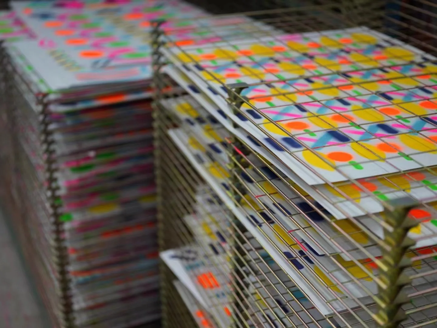 于是,当粉丸把这些层叠的研究与思索,逐一拼贴在作品之上,便使之拥有了相对繁复而又具有融合感的样貌。而制作工序也是如此,纸张首先被充满序列感的彩色对称纹理填满。