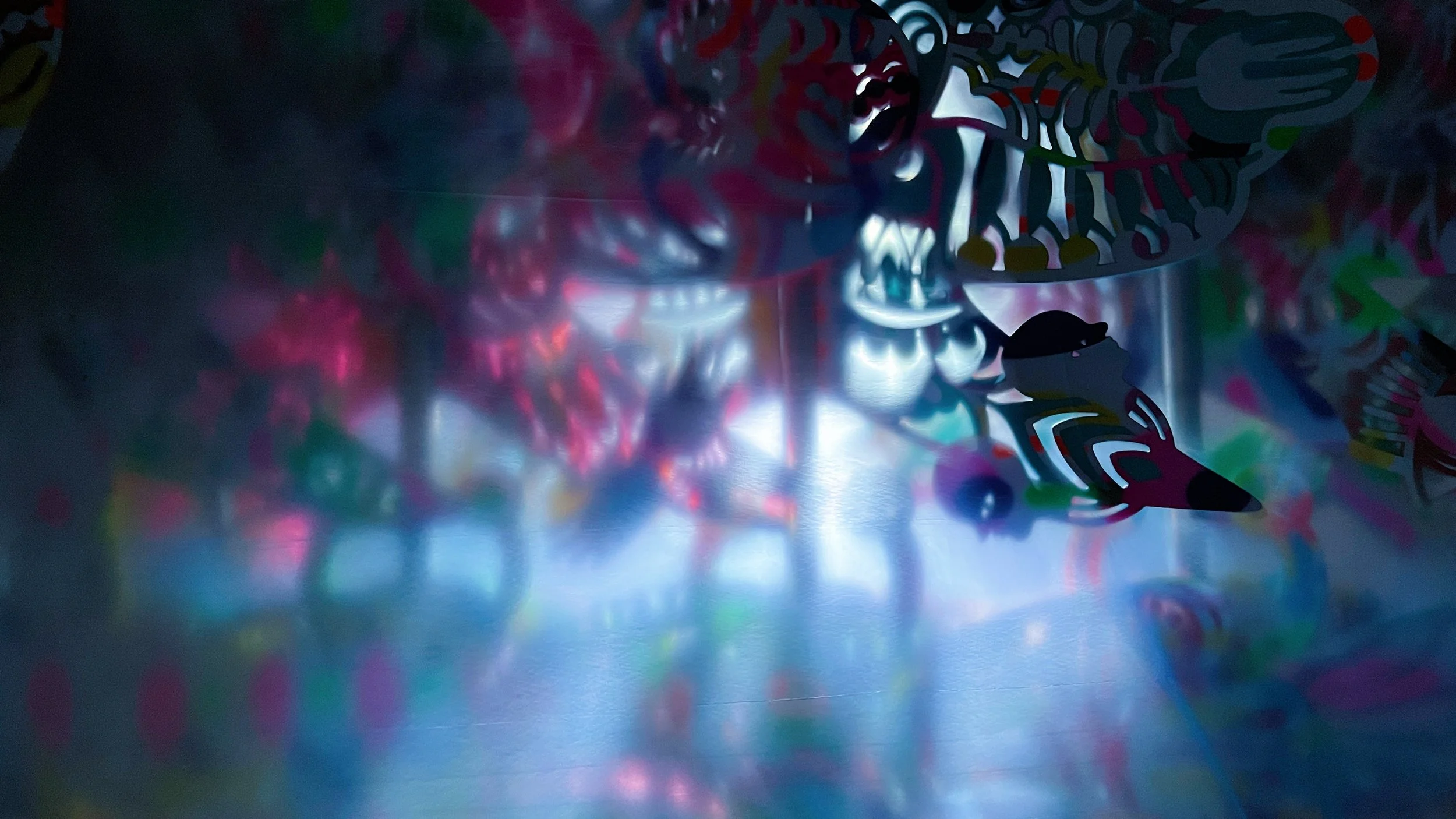 作品分为上中下三层:高空的燕子、与我们并行的蝴蝶、还有水中的游鱼。风筝上覆盖着如针脚般有序列感的对称纹样,也镂空着我日常创作中的对称图腾。风筝的对称造型模仿飞行生物,是关于自然的对称。而风筝与人的关系,是一场关于控制的对称游戏。在这个人为制造的对称空间里,对称之美被高密度地并置,以至于我们都无法忽略。