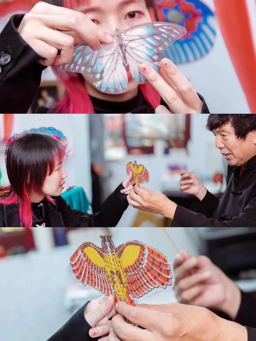 The works are divided into three layers: swallows in the sky, butterflies in parallel with us, and fish in the water. The kite is covered with symmetrical patterns with a sense of sequence like stitches, which also hollow out the symmetry totem in her daily creation.