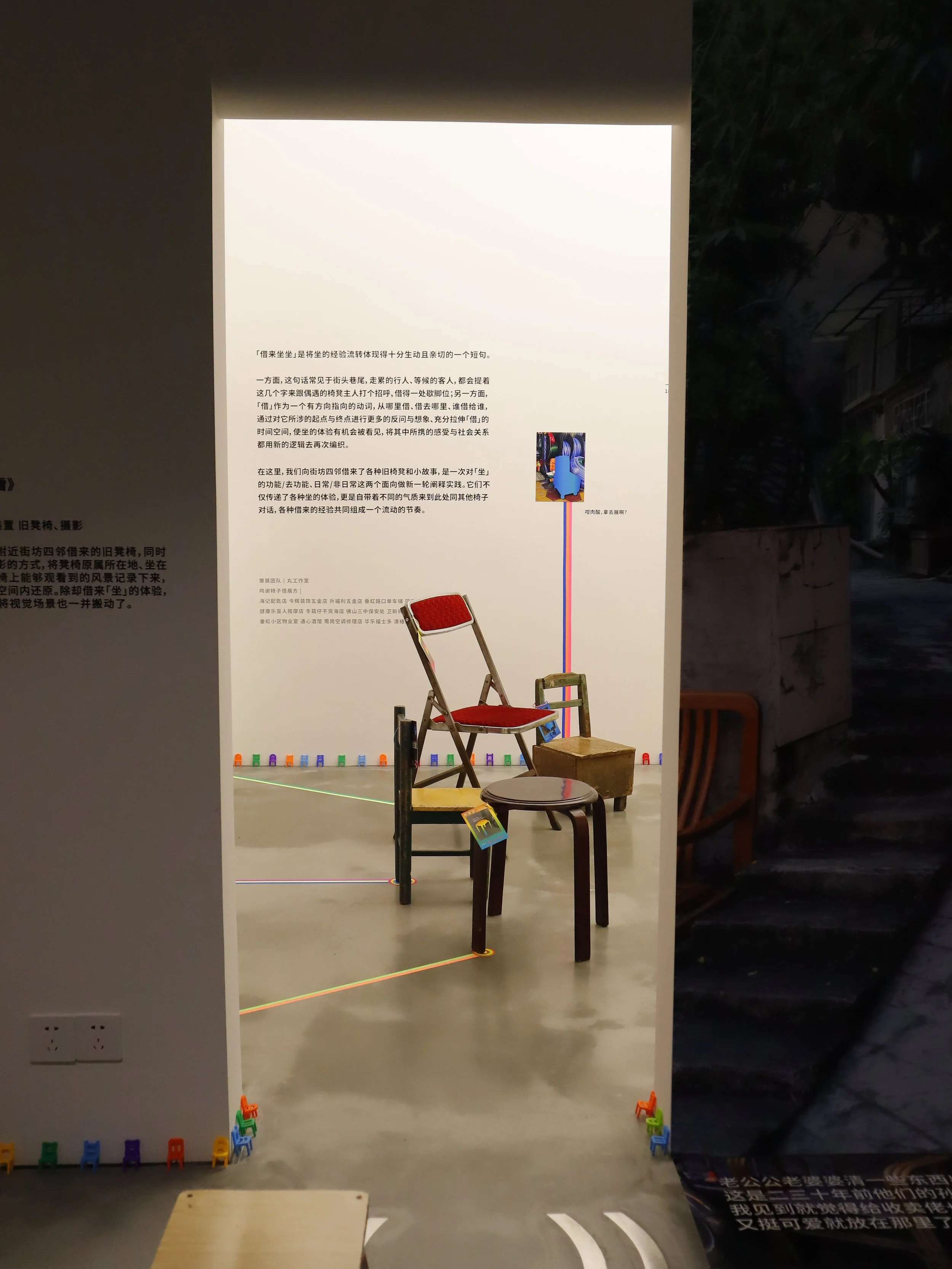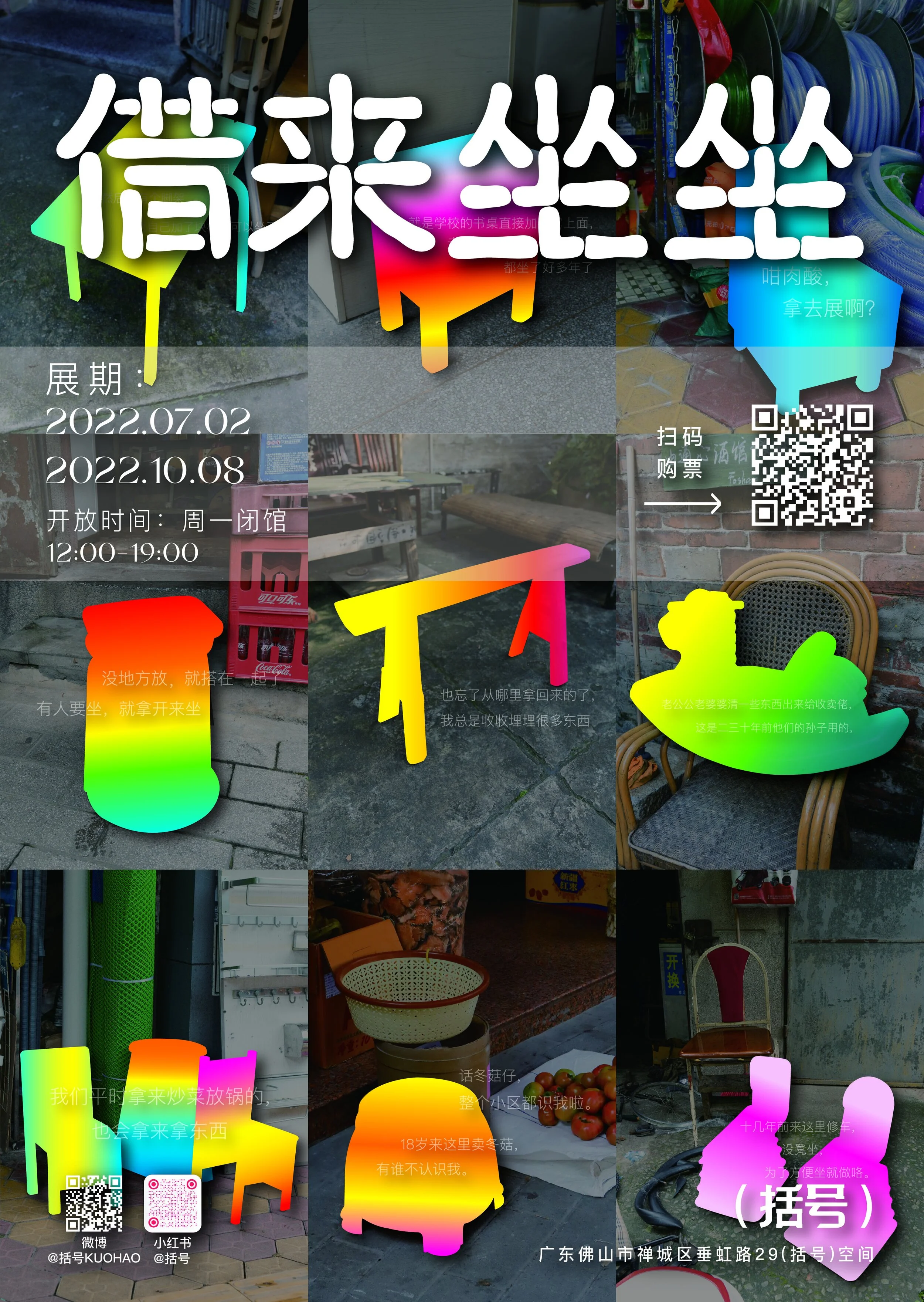 而 (括号) 的第二回展览被命名为 ((借来坐坐)),我们向社区的街坊四邻借来了各种旧椅凳和小故事,并借此基础尝试将“坐”这一动作主题拎出讨论。展期将从2022年7月2起,持续到10月10日。