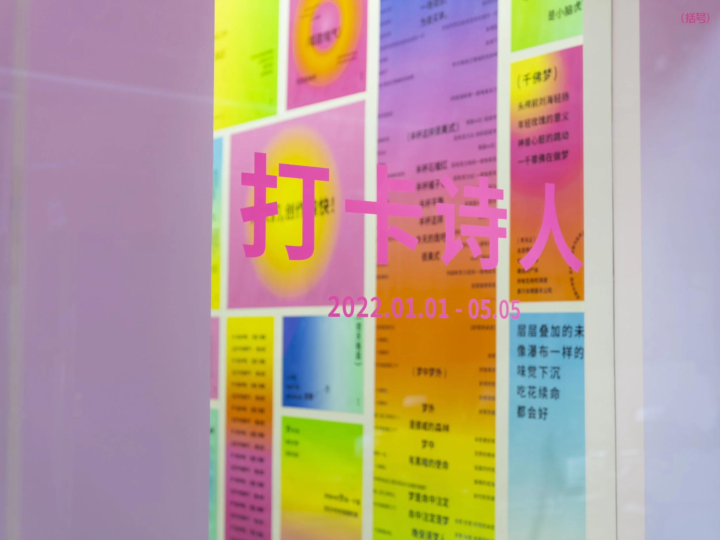 (括号) 空间内首个展览 —— (打卡诗人) 展曾于2022年1月至5月开放。“打卡诗人”是一个关于文字组合游戏的长期项目,最初由陈粉丸发起,希望通过建立一个类似上班打卡的游戏秩序,在日常生活中保持好奇并寻找随机性。