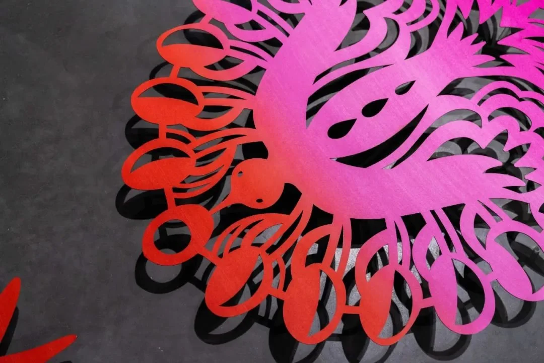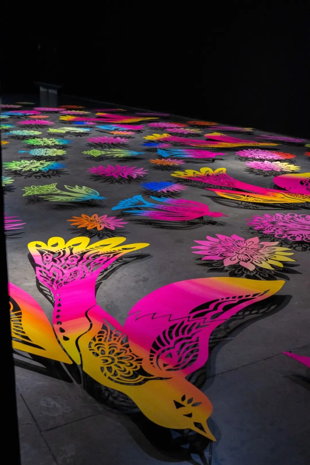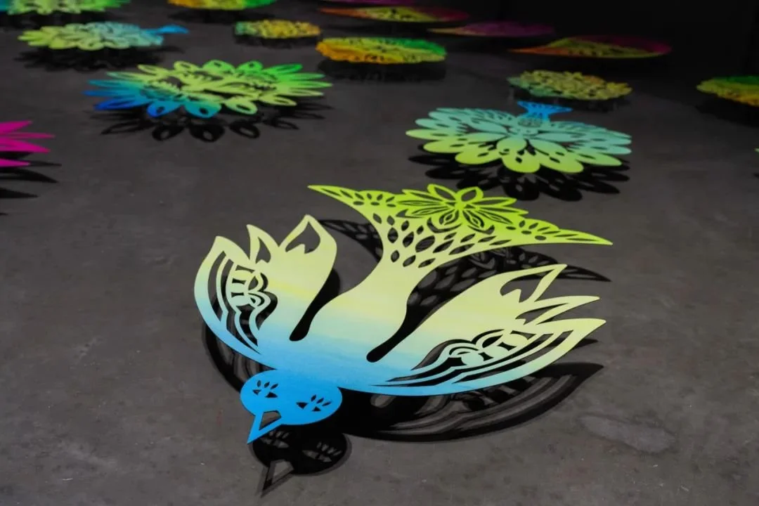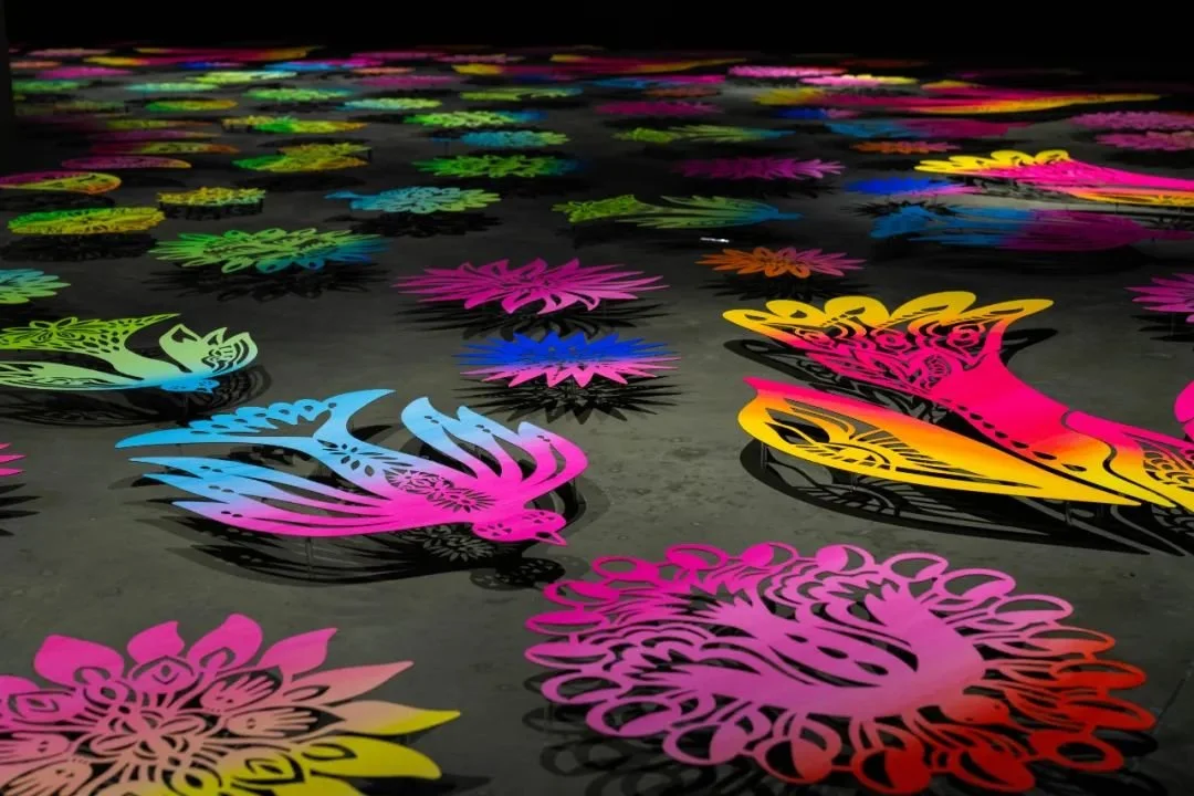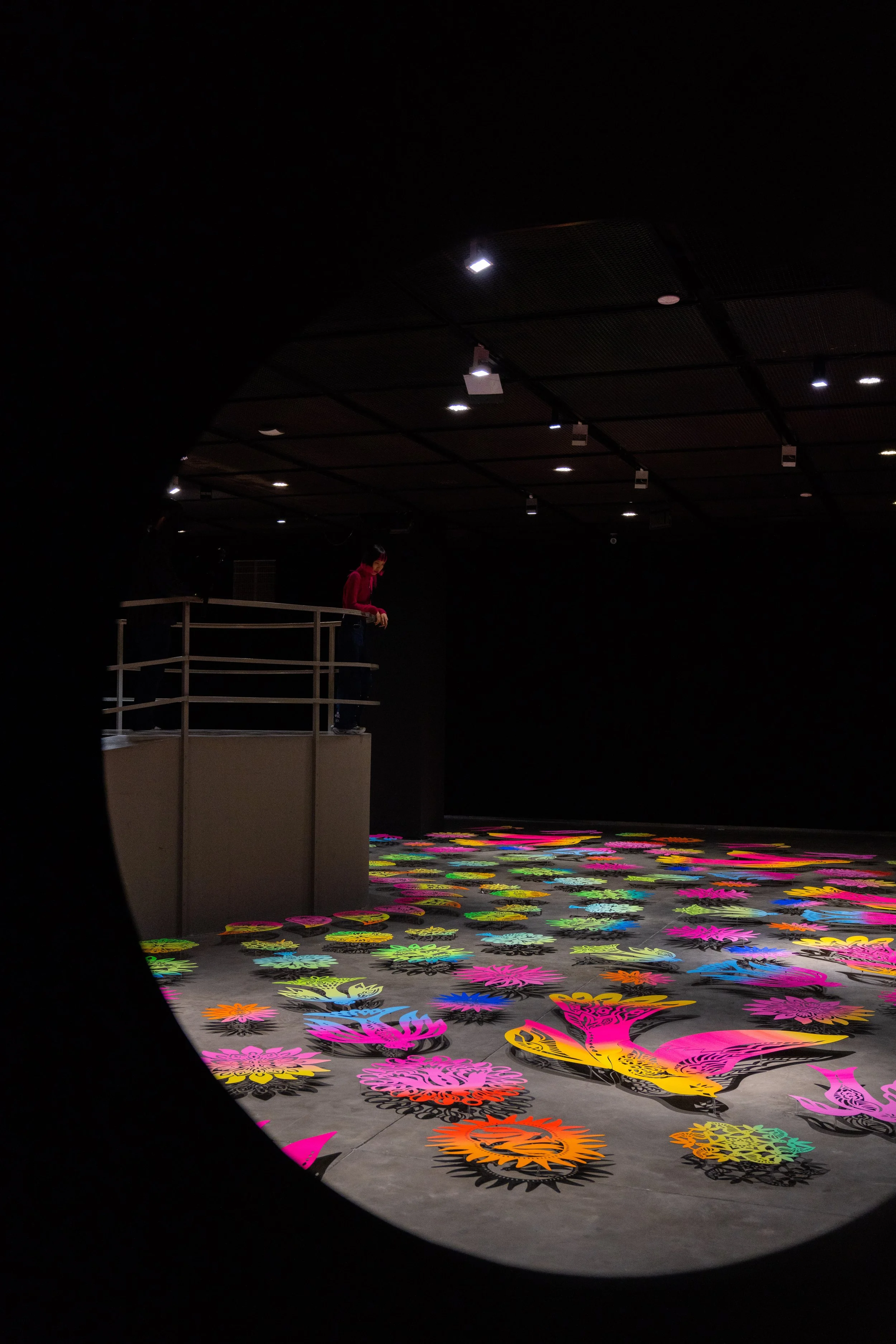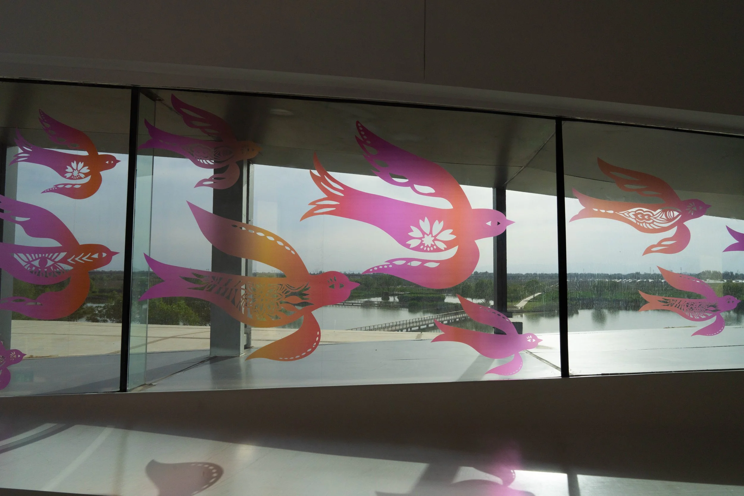 On the third floor of the art museum (the work Looking Down at the Sun is on the negative floor), a narrow and transparent glass once touched Fenwan during the pre-creation investigation. From the memory of paper-cutting as a window decoration, window becomes a symbol of eternal romance. Thus, in another part of the exhibition hall, there is an extension of the work -- the Sun Bird that forms light and shadow.