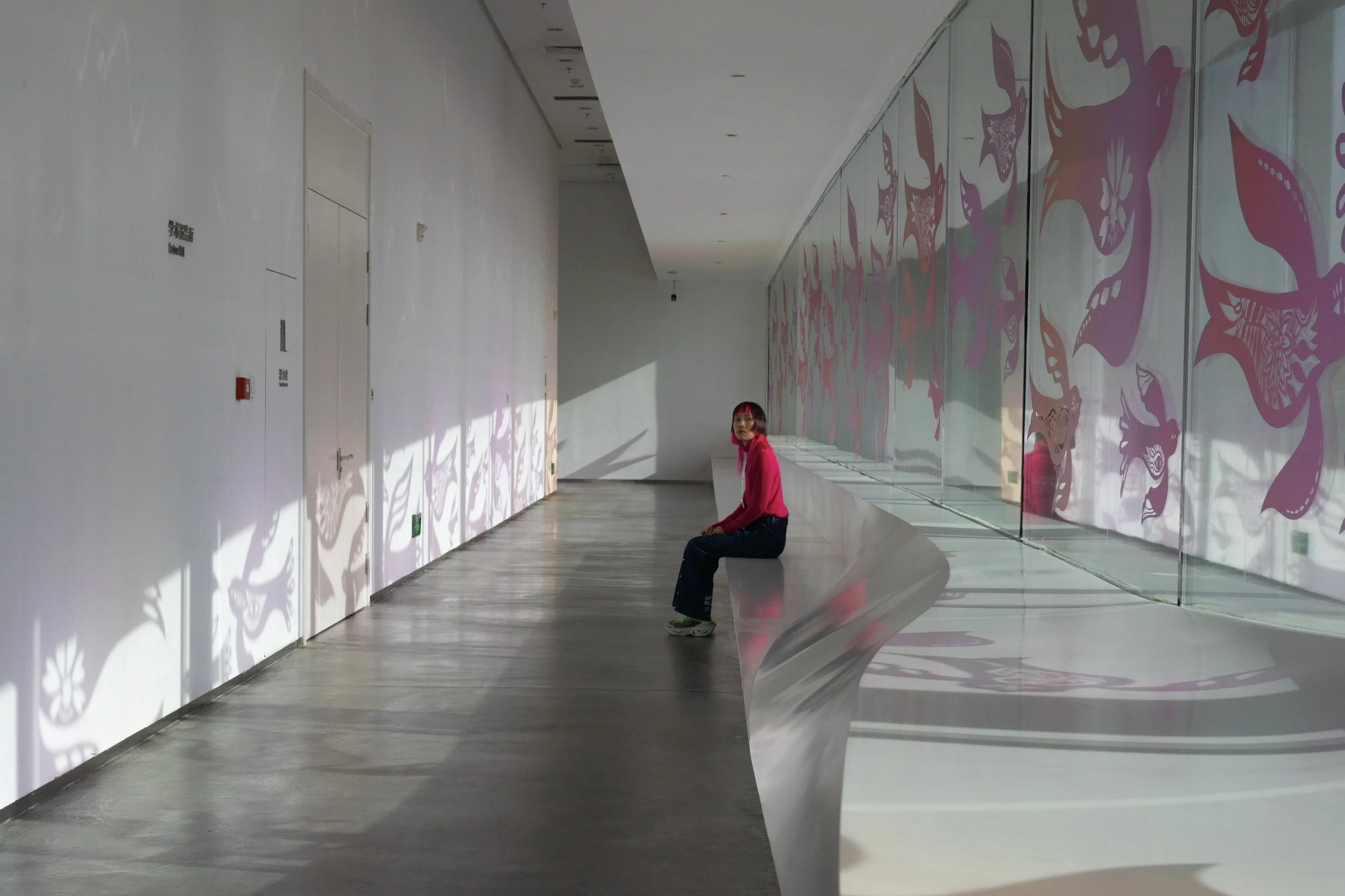 在美术馆的三层(《低头看太阳》作品在负一层),一道狭长而通透的玻璃曾经在创作前考察时打动了粉丸。从剪纸作为窗花流传的记忆走来,窗户是一扇恒久浪漫的符号。于是在展厅的另一处有了作品的延伸 —— 在天朗气清时会形成光影的「太阳鸟」。