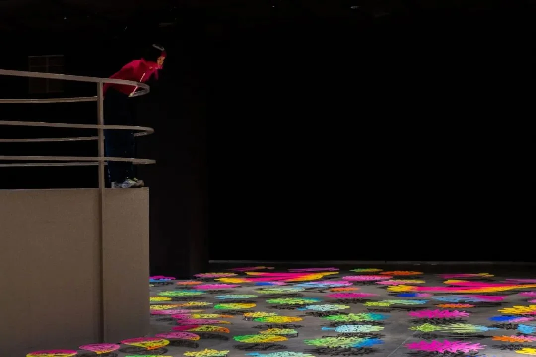 镂空的剪纸也透过灯光在地面上形成明显的倒影。如若彩色的表面已经象征抽象水面上的太阳,这多出来的一层光影则提供了更多的想象空间。