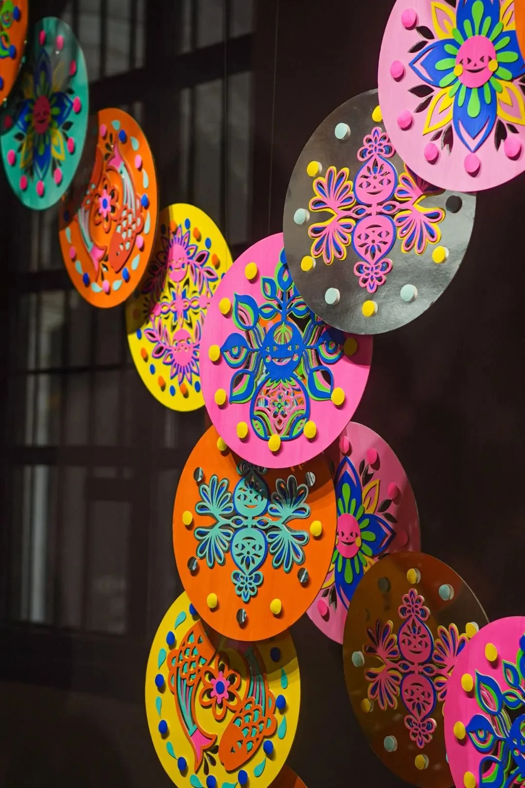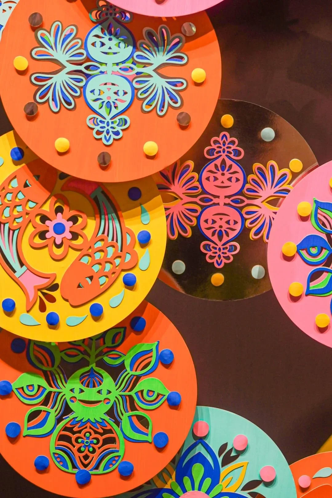 其中,龙首仍脱胎于《不息》,在新春之际融入更多高饱和度色彩、与团纹呼应的圆。而粉丸通过层层叠叠的分散组件吊挂,以及具有浮雕感的剪纸技艺处理,令作品栩栩如生。