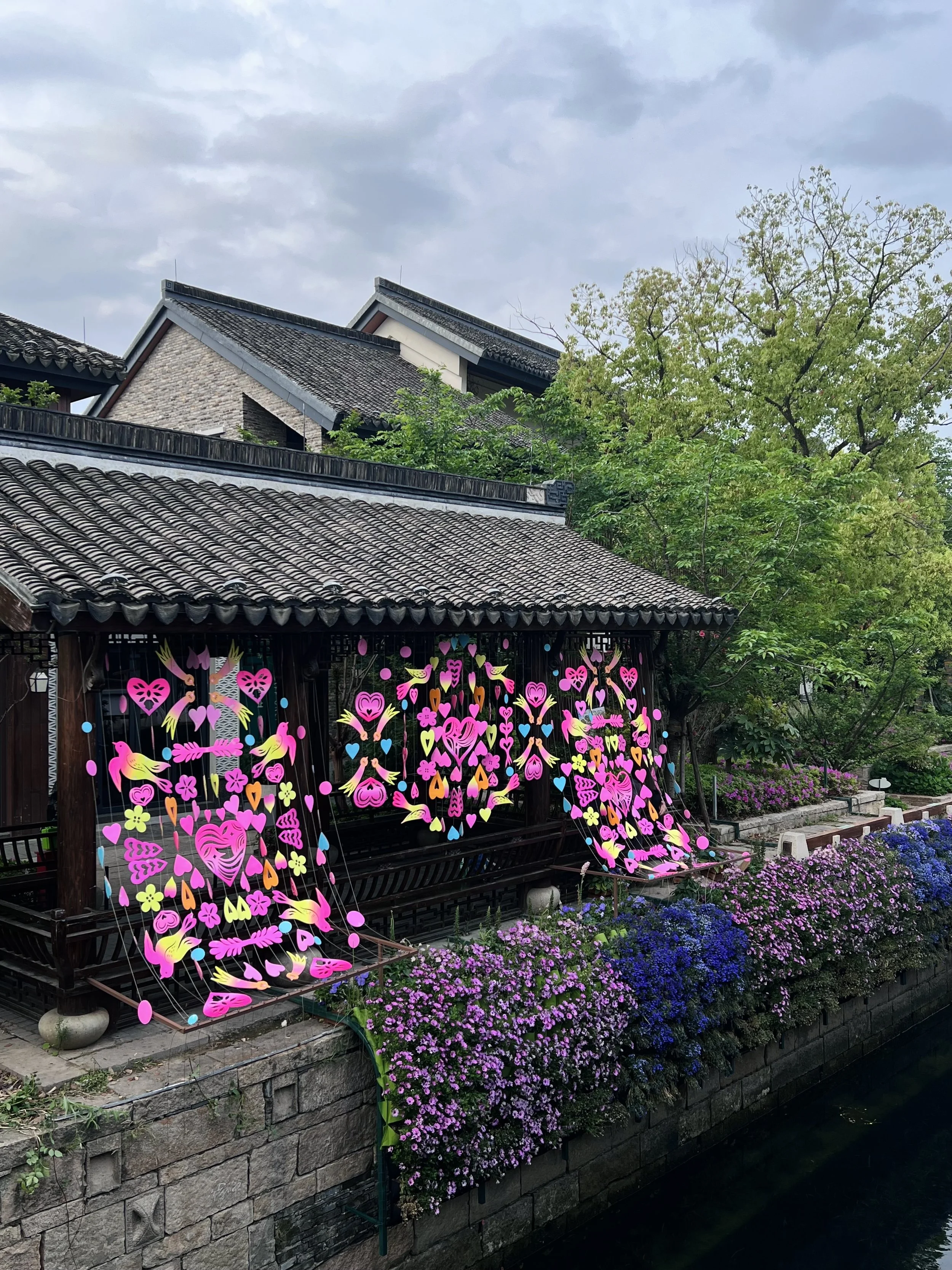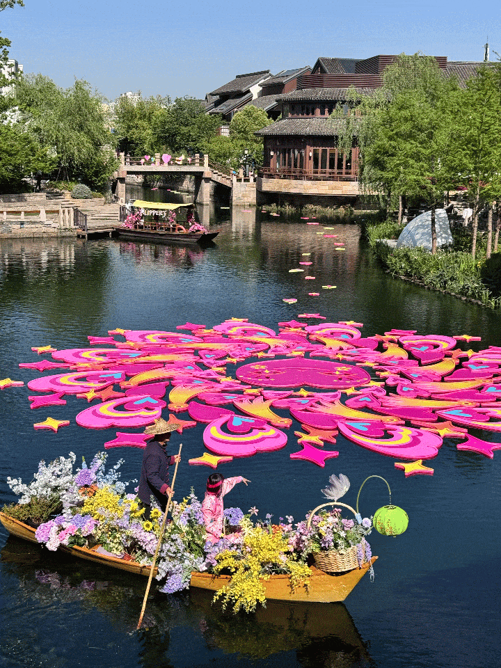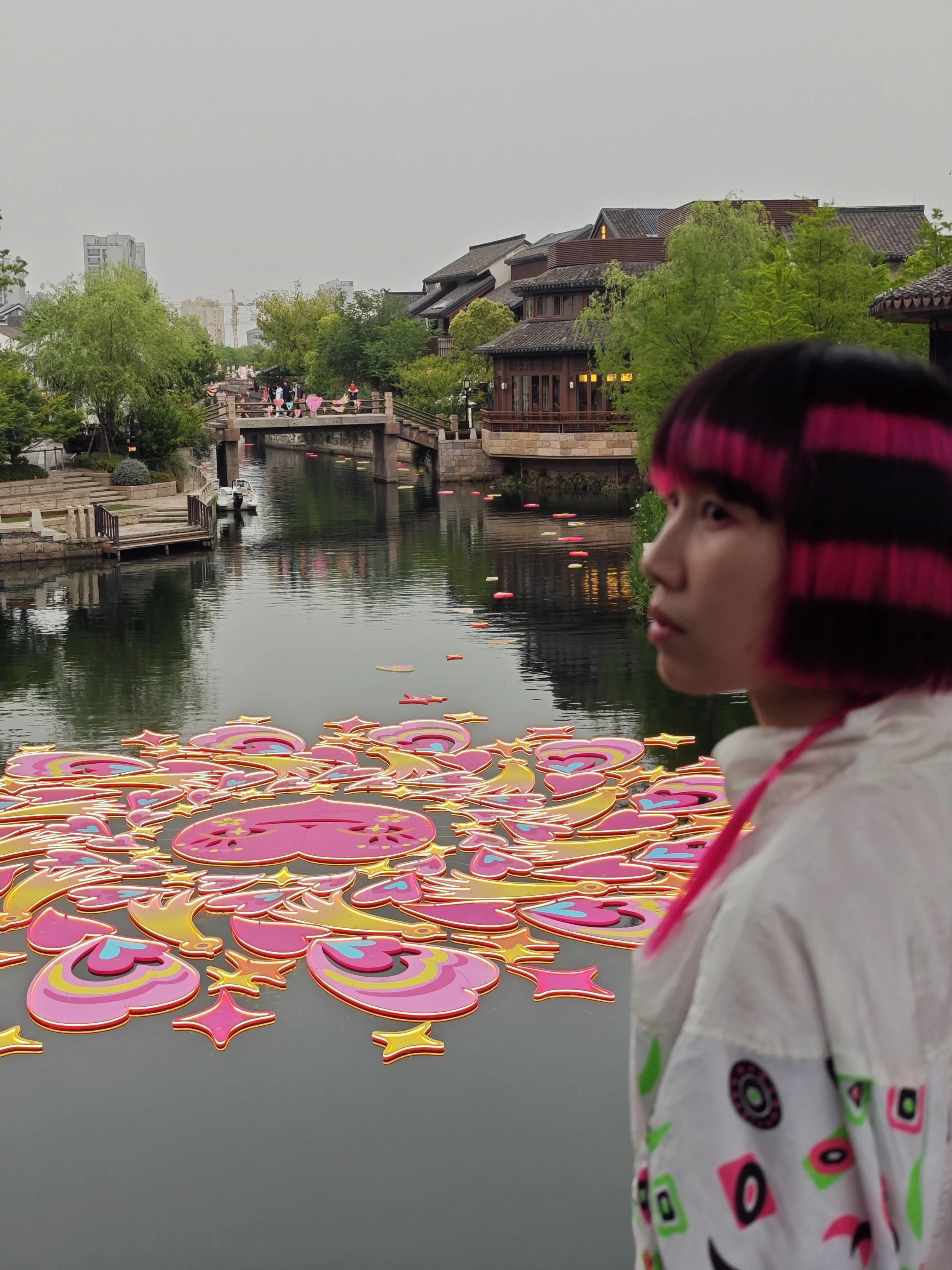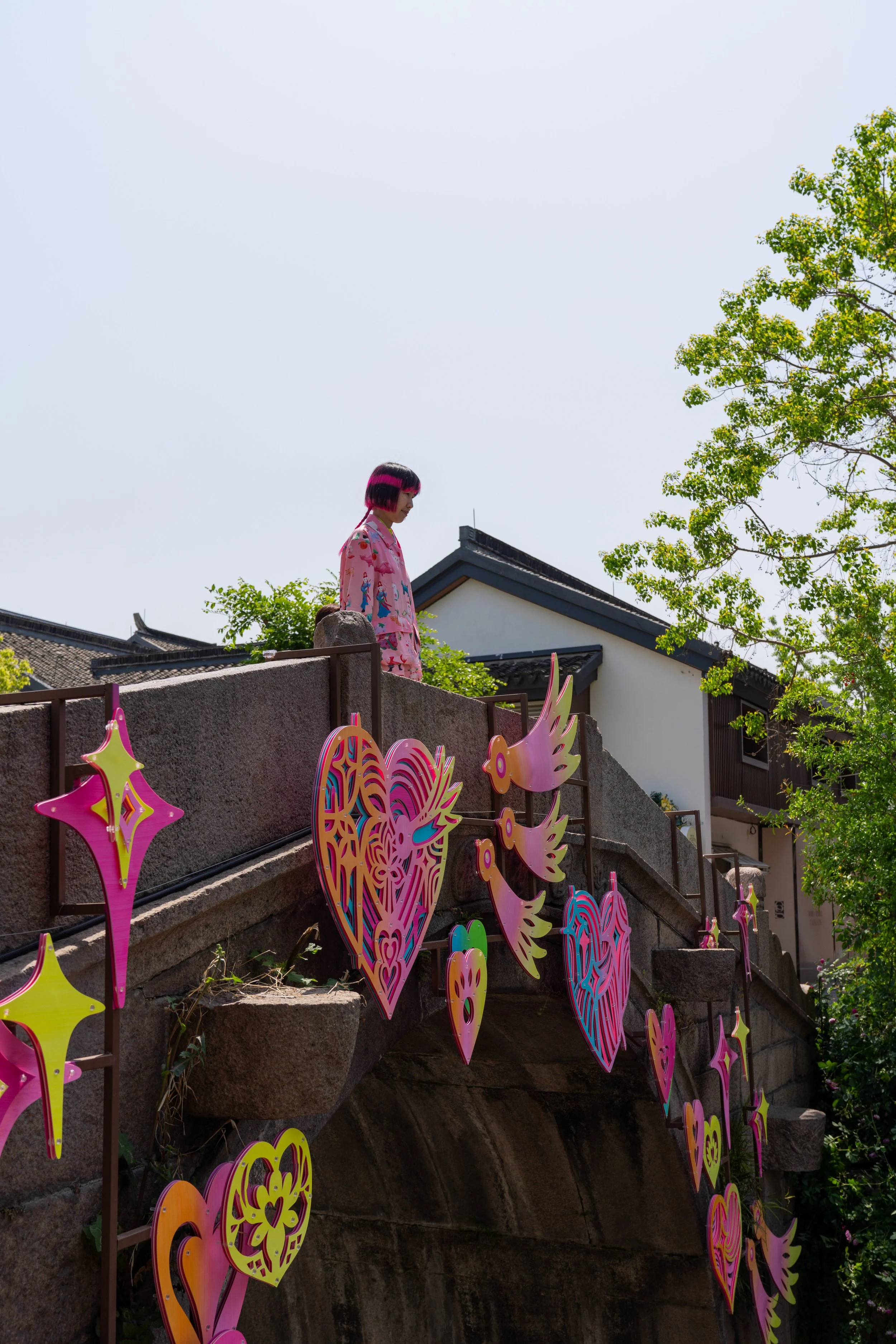 粉丸为蟠龙水域贴上一幅鲜艳的大型粉色窗花,它作为视觉元点,以此为起始,散点图案沿着细长河道缓缓扩散、逐渐布满,沿着细长河道徐徐扩散、铺陈开来。它们与古朴的建筑、悠悠绿水相互映衬,为传统的江南水乡景致注入了当代艺术的鲜活气息。