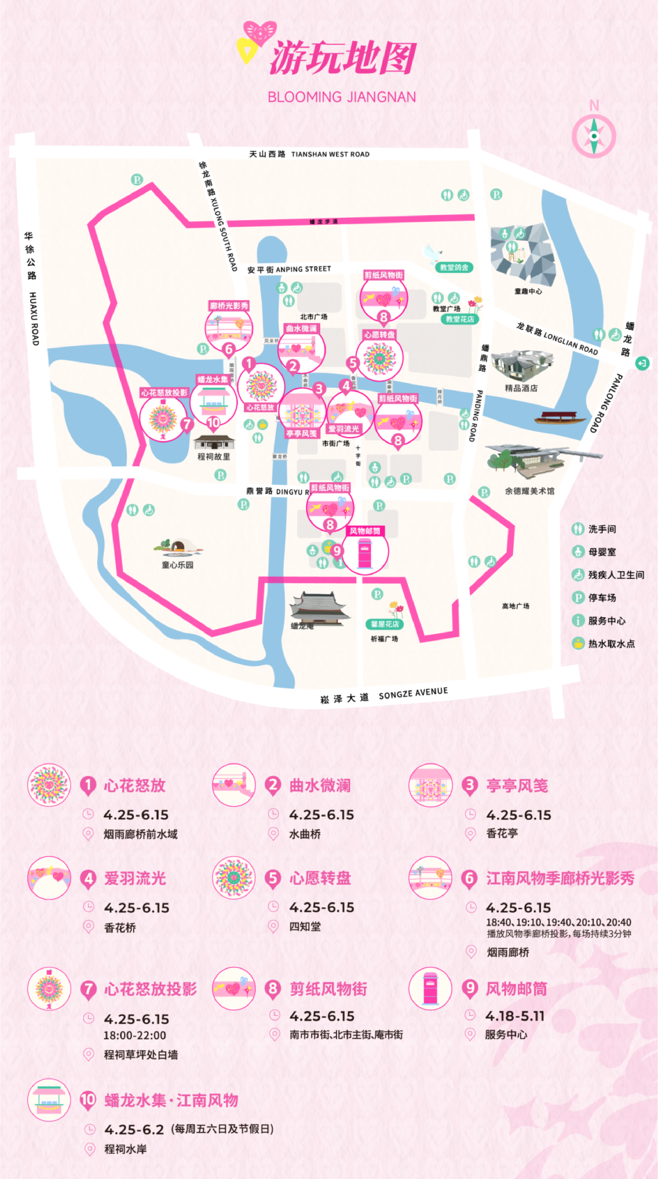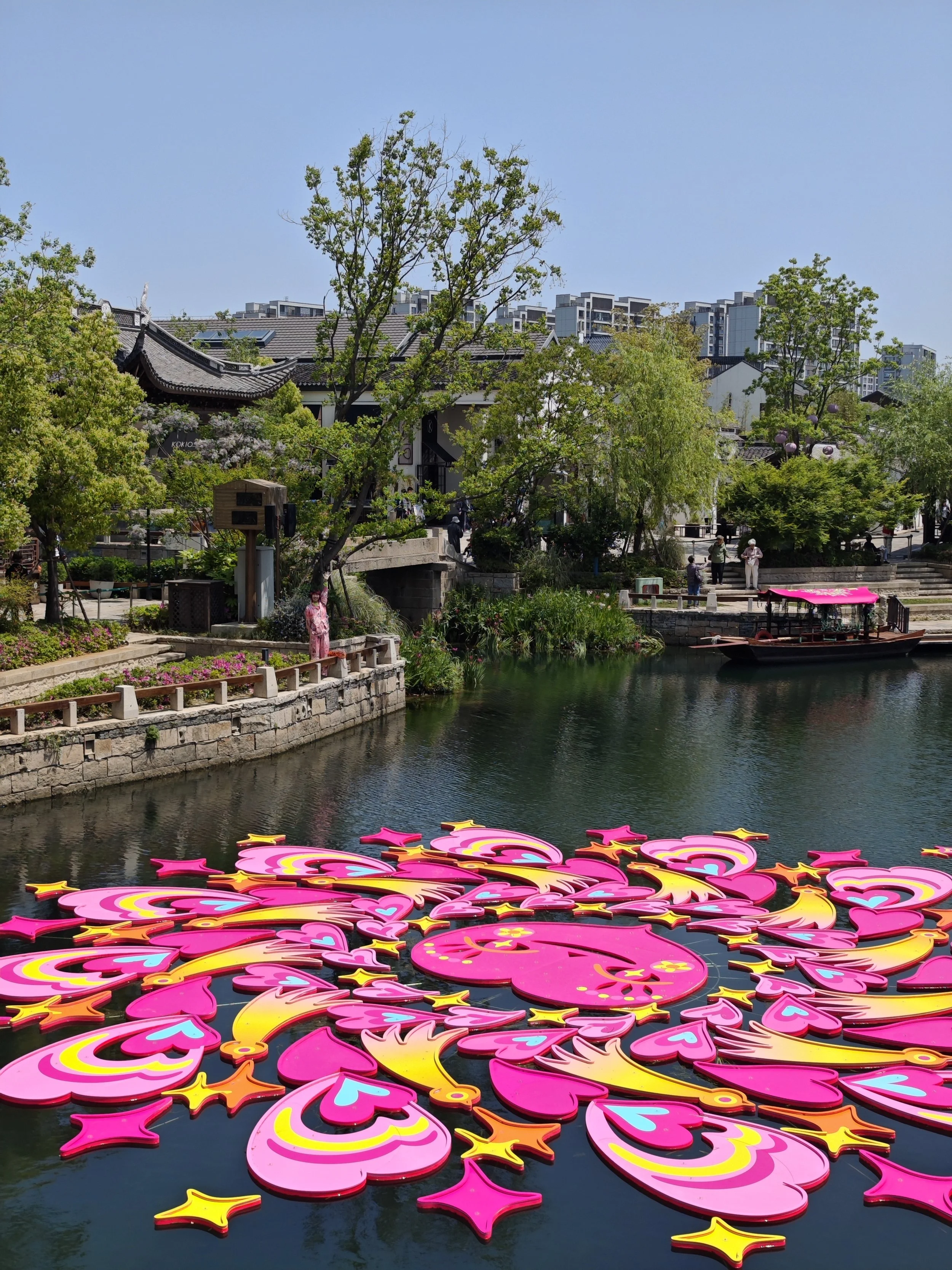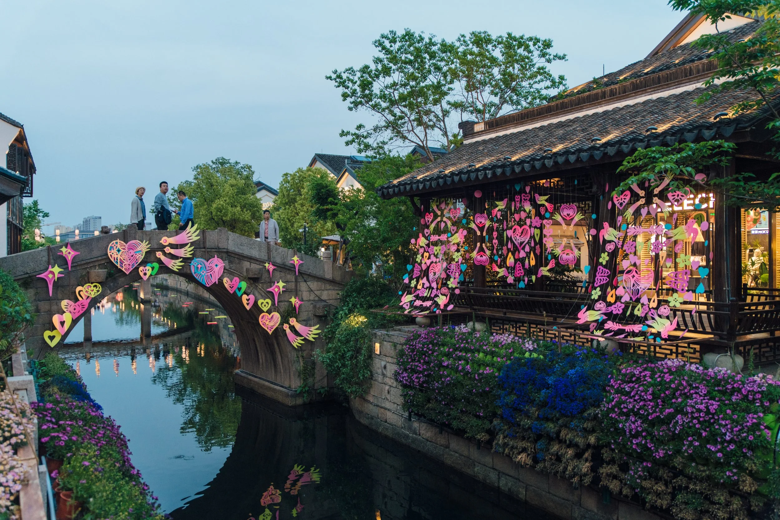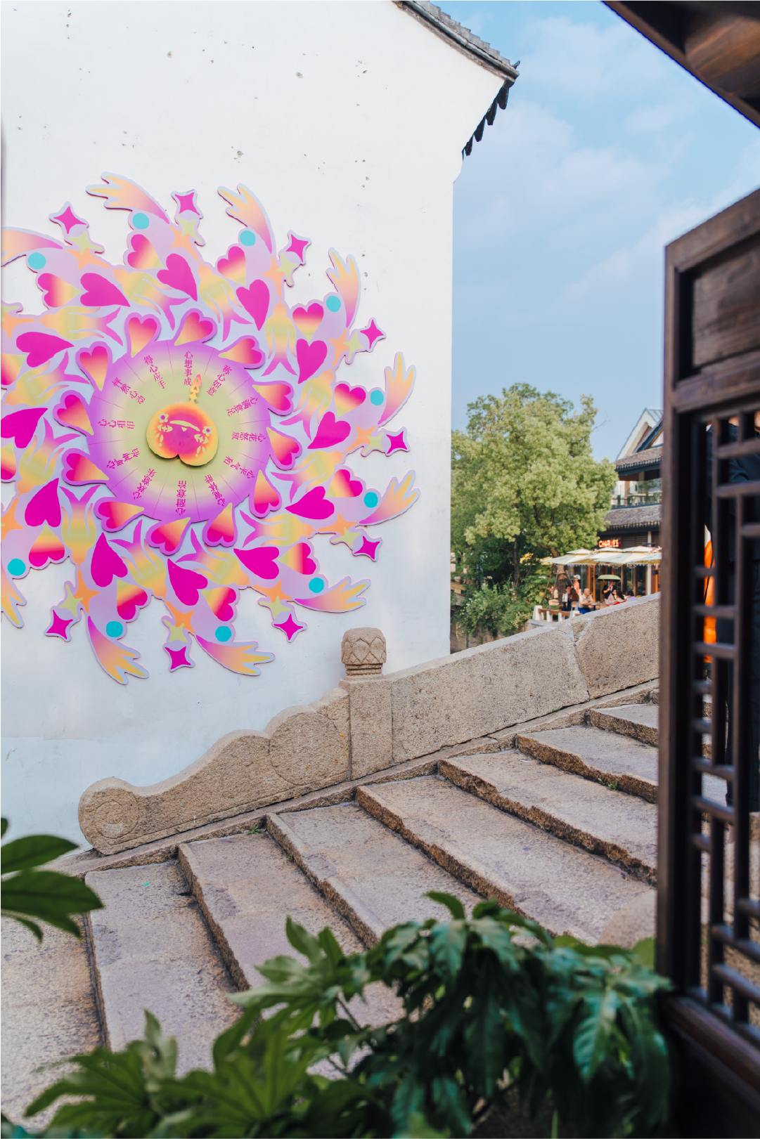 粉丸为蟠龙水域贴上一幅鲜艳的大型粉色窗花,它作为视觉元点,以此为起始,散点图案沿着细长河道缓缓扩散、逐渐布满,沿着细长河道徐徐扩散、铺陈开来。它们与古朴的建筑、悠悠绿水相互映衬,为传统的江南水乡景致注入了当代艺术的鲜活气息。