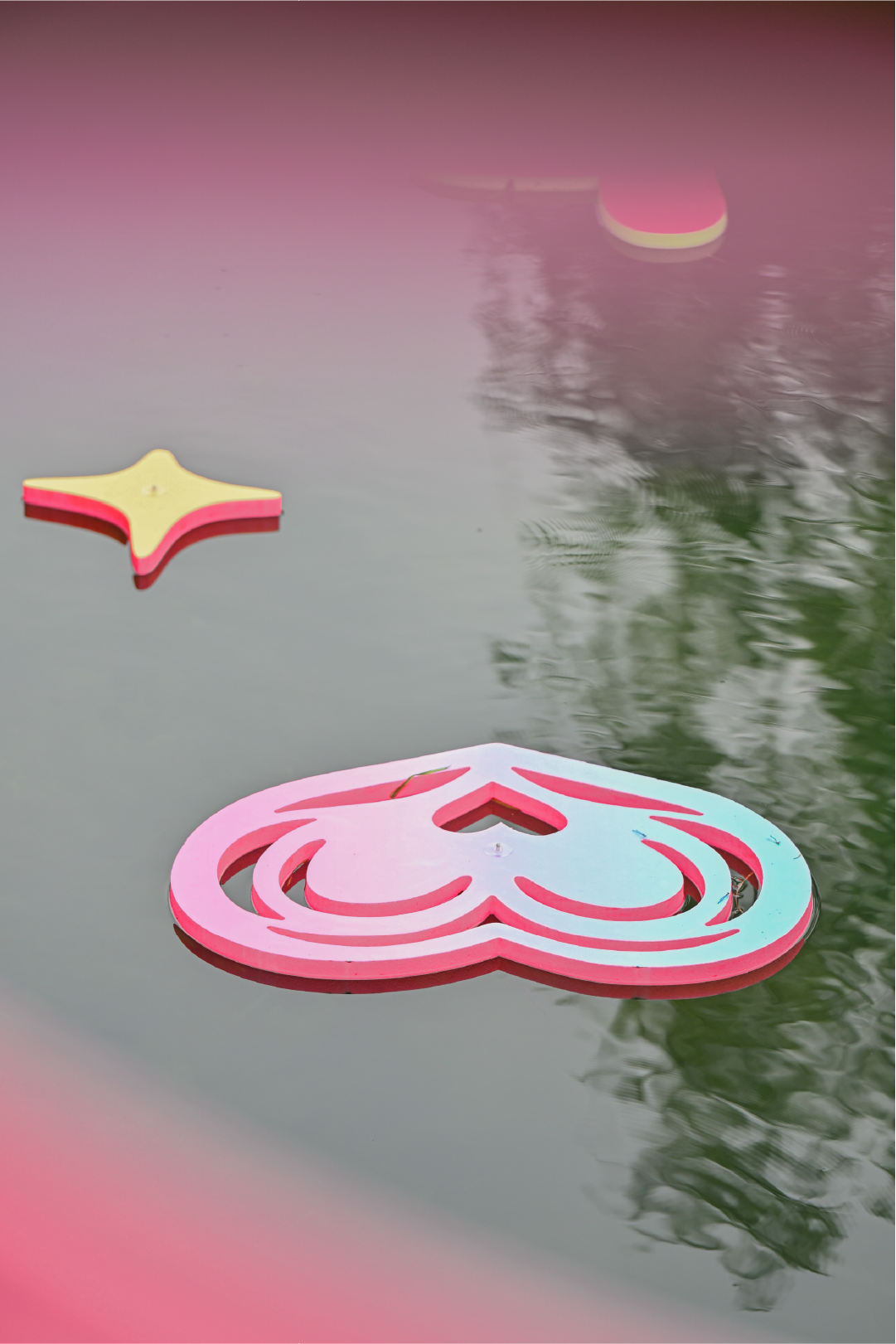 在蟠龙天地,粉丸的粉色剪纸贯穿始终,随水流转,随桥联结,随光变幻,随风摇曳,诉说着“流动的爱”——柔和、绵长、且无处不在。