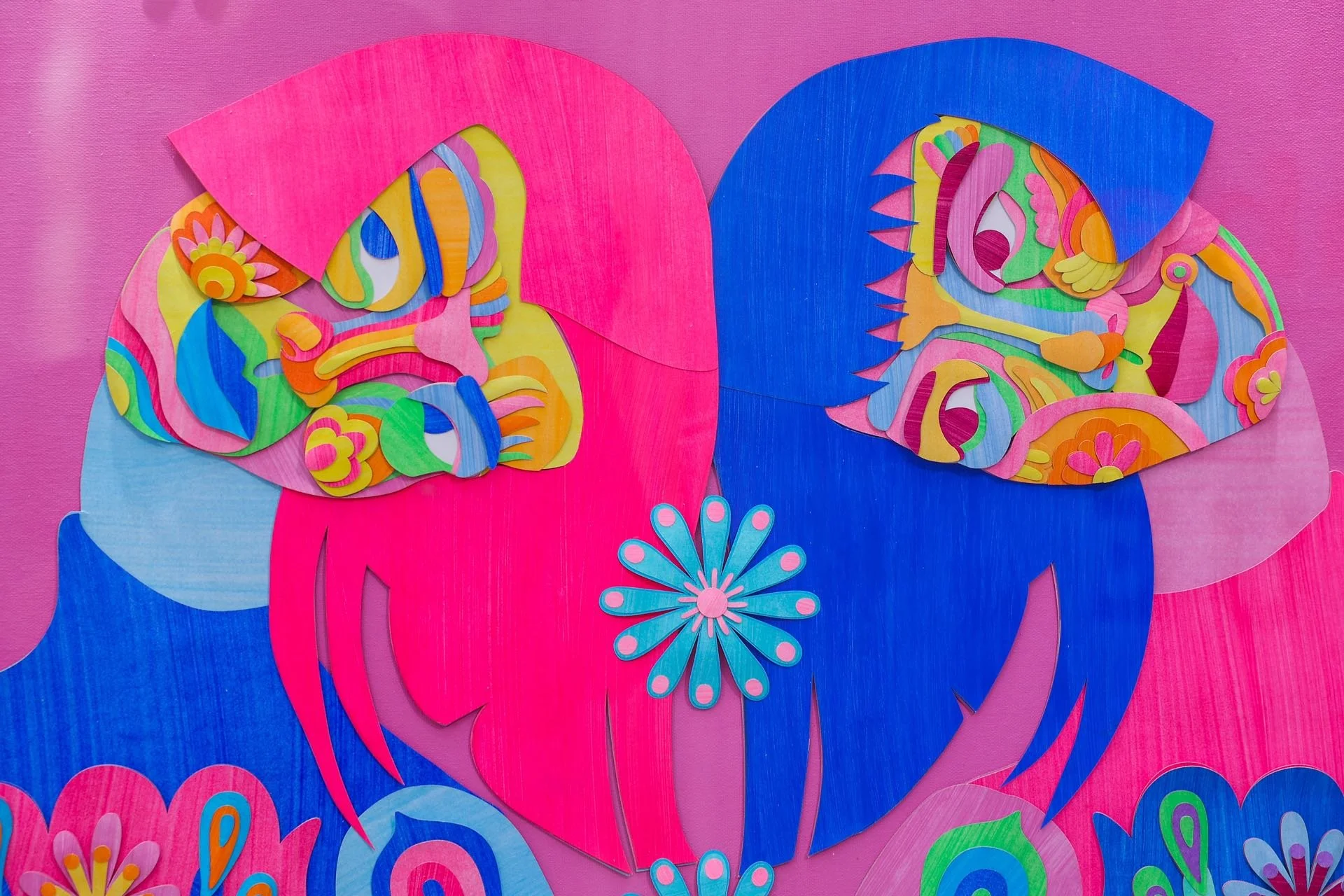 除了“纸宇宙”,粉丸的架上拼贴作品《我的轴对称》此次也漂洋过海来到了展览现场。自2022年初起,粉丸开始探索一种新的表现形式——在油画布上进行剪纸拼贴创作。这一系列作品以“对称”为核心主题,将自己和身边人的肖像置于多彩密集的剪纸色块中,色块的层层叠加赋予了作品独特的质感和厚度,使其超越了传统平面绘画的界限。这种创作方法融合了平面与立体、绘画与雕塑的特质,不仅展现了纸的多样可能性,更传递了一种细腻、叙事性的情绪。在这幅作品中,“对称”突破了视觉平面,上升为一种情感隐喻,在粉丸的理解中,“对称”是一种动态的关系结构,例如,“我爱你”与“你爱我”,代表了人际关系中的相互性和平衡。