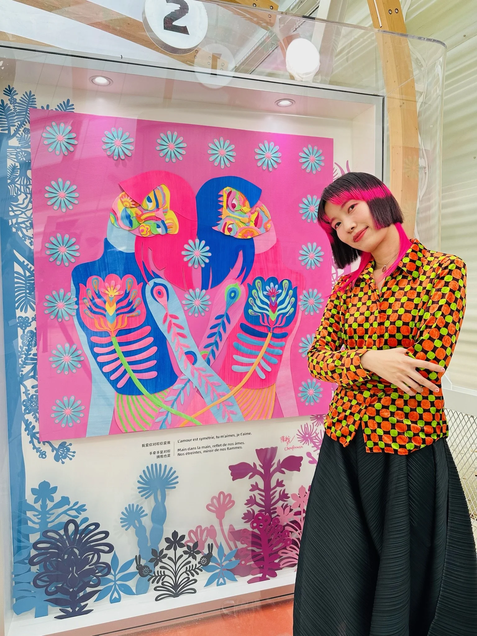 In addition, Chen’s My Axisymmetry also made its way across the ocean to the exhibition. Since early 2022, Chen has been experimenting with a new medium: collage on canvas, utilizing paper-cutting techniques. The series takes "symmetry" as its central theme, embedding portraits of herself and her close connections within vividly colored, intricately layered paper-cut fragments. The layers of overlapping hues lend the work a distinctive texture and depth, pushing beyond the constraints of traditional two-dimensional painting. Combining elements of flat and sculptural art, her approach highlights the diverse possibilities of paper while imbuing her creations with a delicate, narrative emotional resonance. In this art piece, "symmetry" evolves from a mere visual concept into an emotional metaphor. To Chen, symmetry embodies dynamic relationships—such as "I love you" and "You love me"—reflecting reciprocity and balance within human connections.