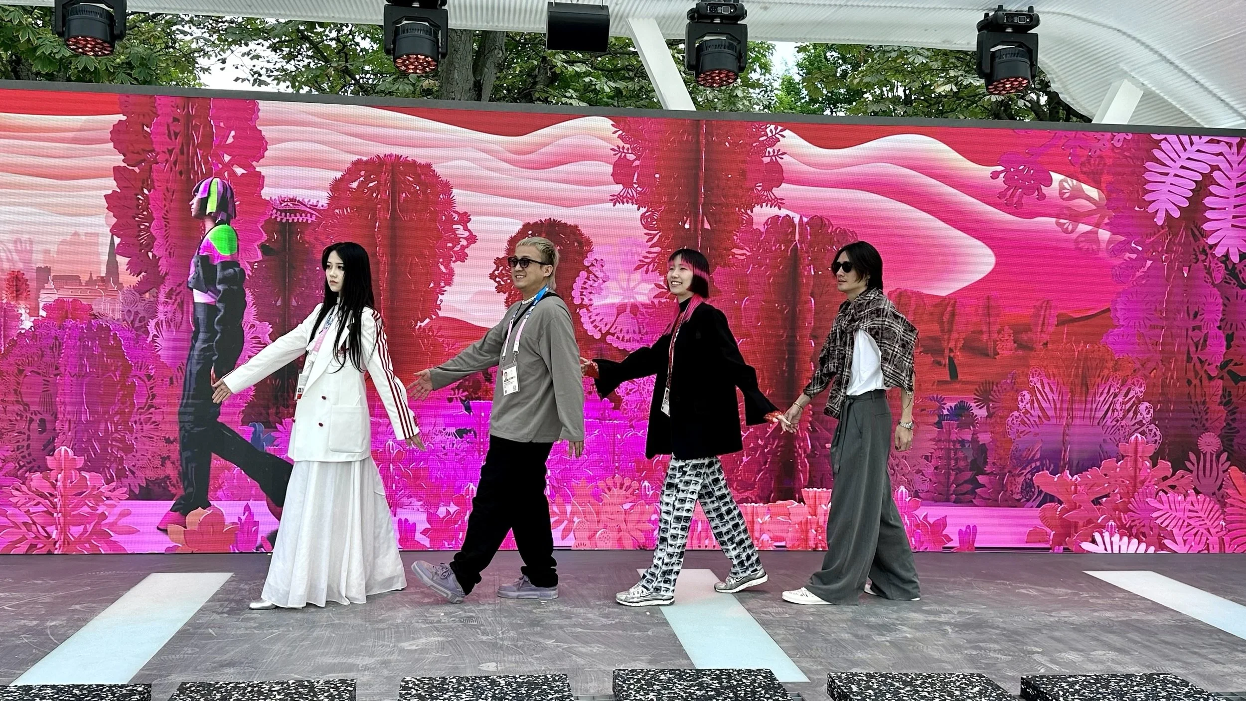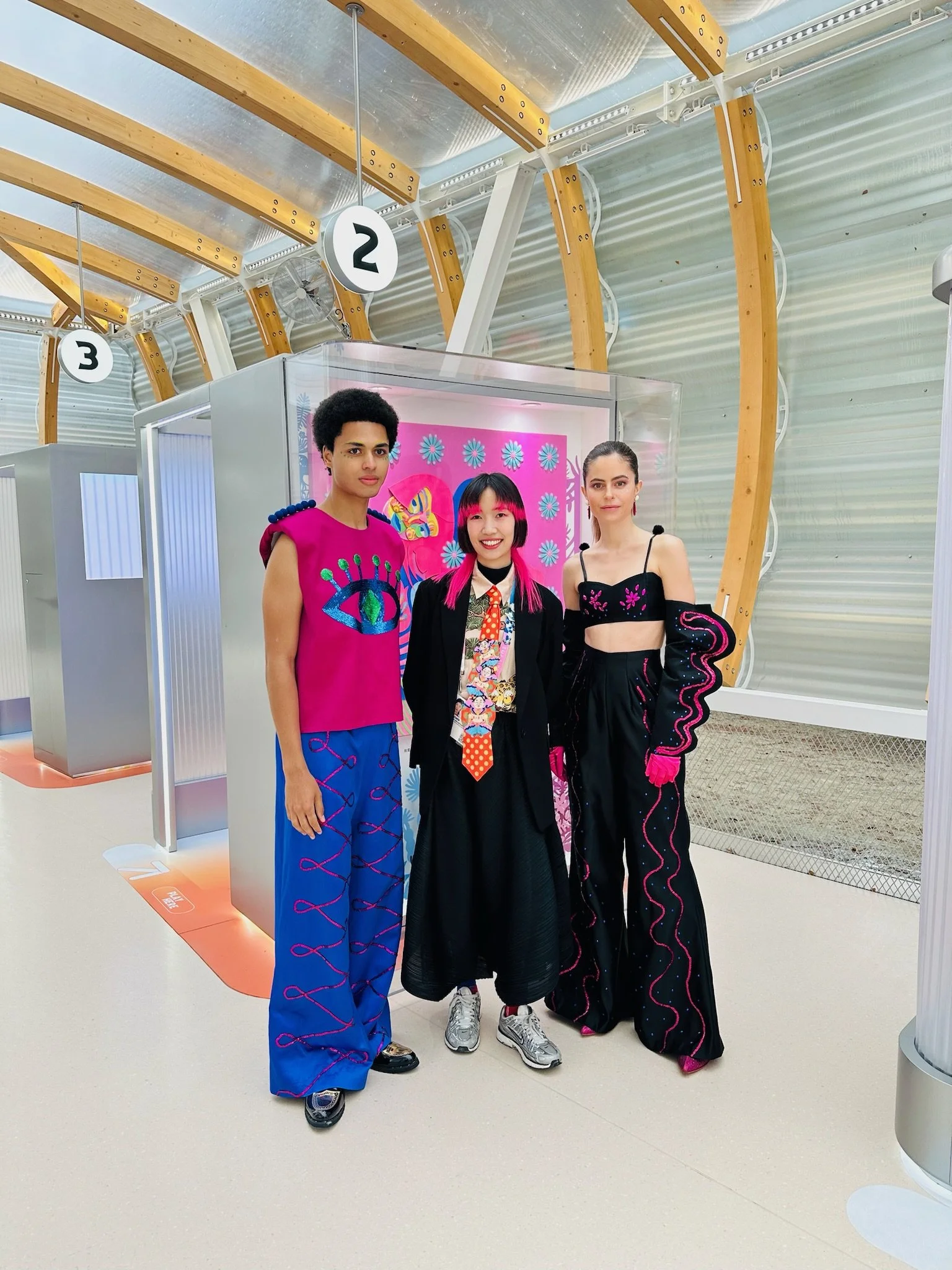陈粉丸在平行世界中创作的服装,经制作后与两位现场模特在“阿里廊”合照