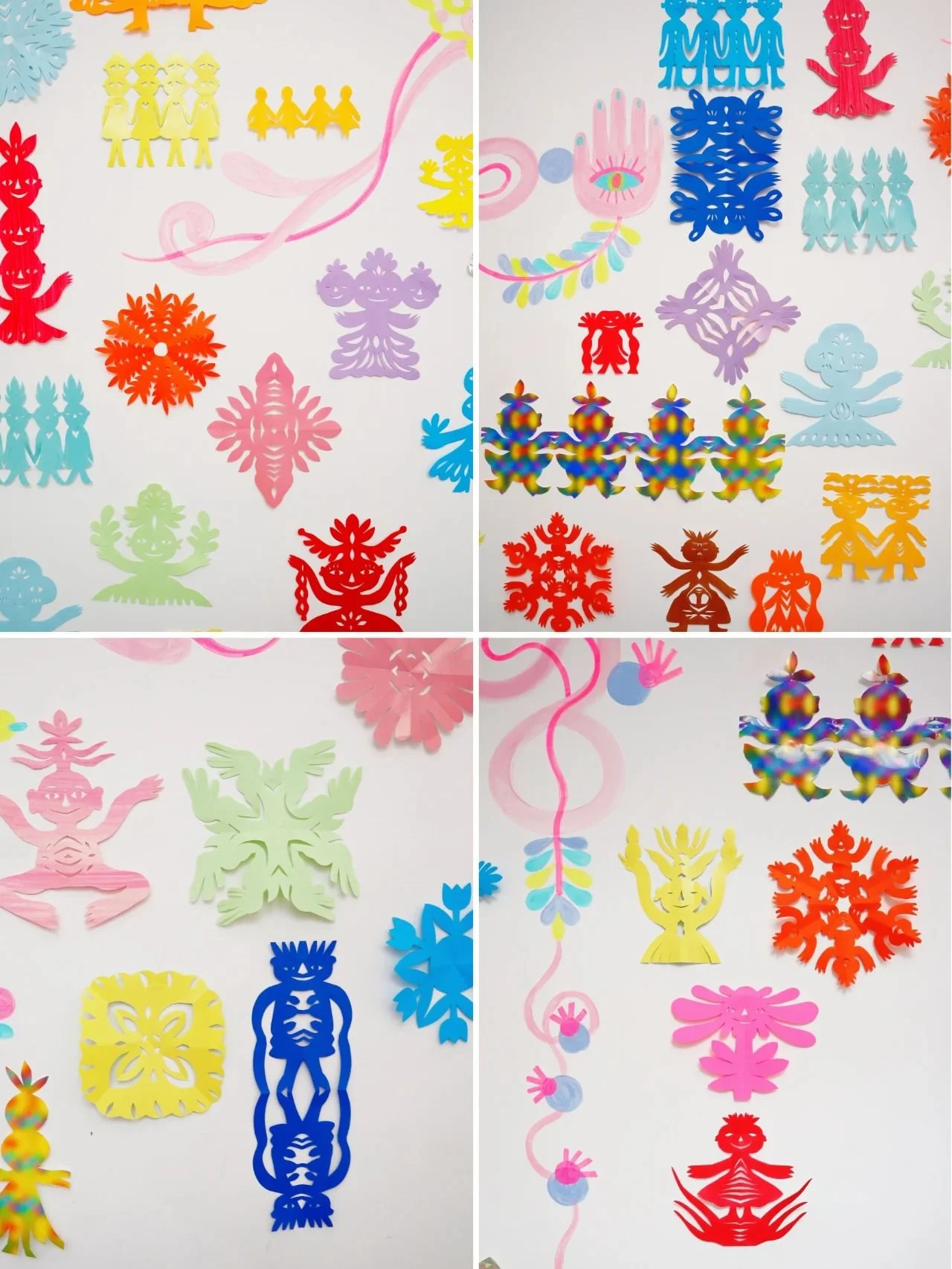 Before being mass-produced, her studio team processed a large number of cut-outs through digital scans into vectorized graphic files, which were then carved and shaped on a variety of hand-colored paper. The mix of manual labor and technology are inseparable in the artist's works, which, as seen in Universe of Paper Cuttings, is also a complex team effort.