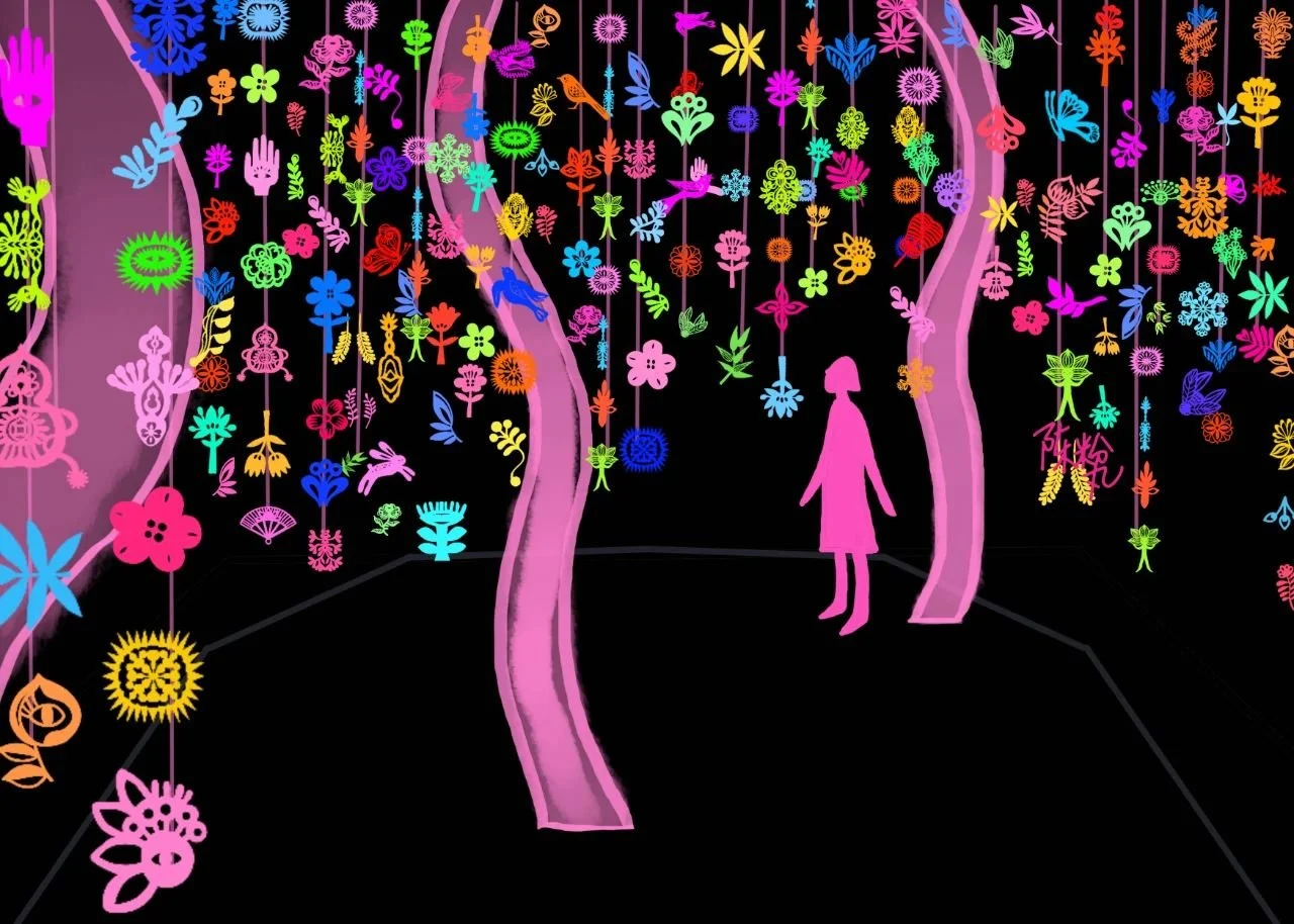 数百计的剪纸图形共同以树的方式联结、生长。施以无限的镜面空间和跳跃彩色,在观众看来就像宇宙一样无垠。 “真正的宇宙不是这些正形,而是被剪去的负形。” 剪纸镂空的正负形是一个意味深远的话题,它往往象征着舍弃与保留,艺术家通过舍弃来获得形状。沿着一张方形的、本不通透的纸张剪去的碎片,最终以相反的方向所去无踪。