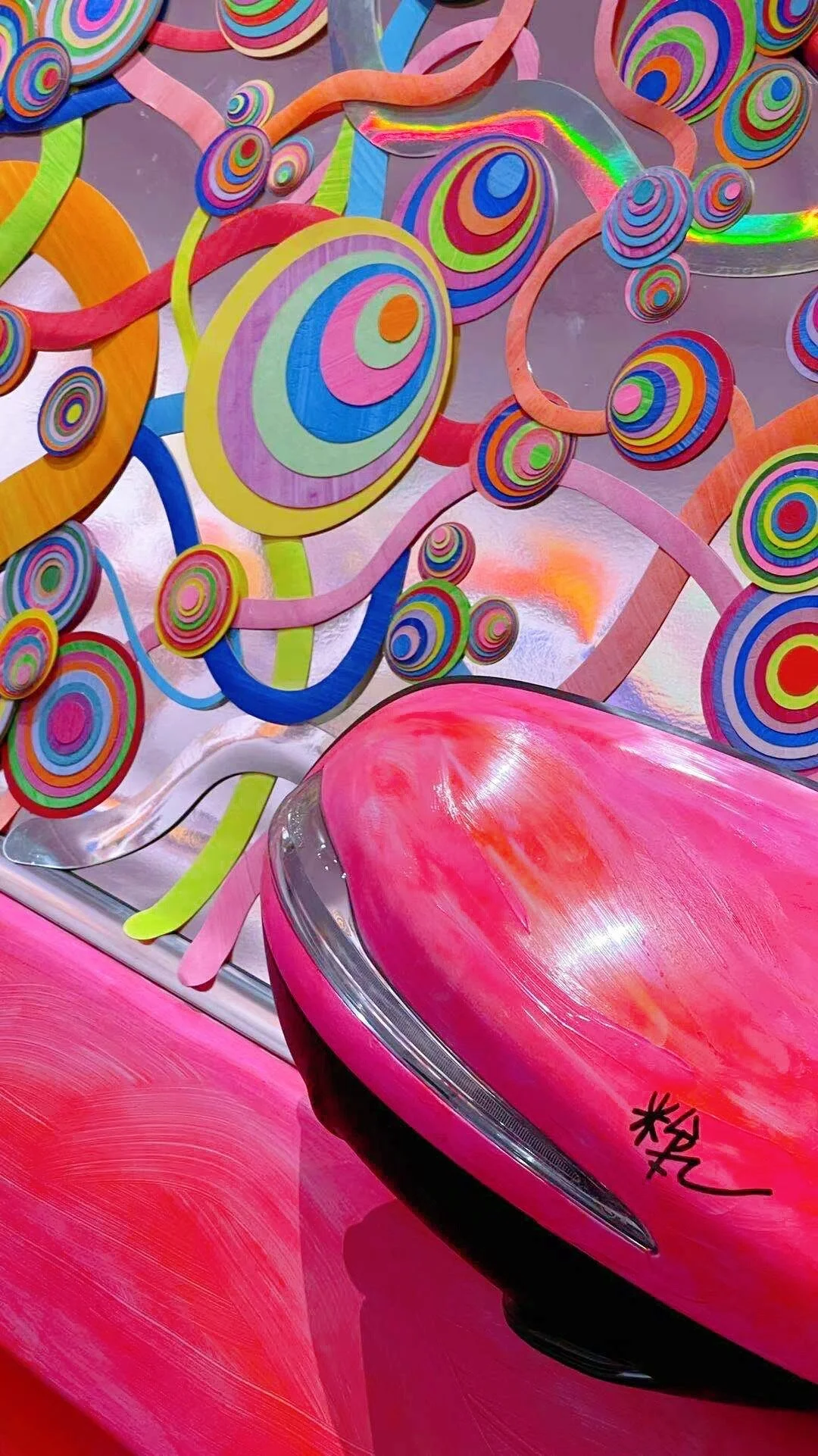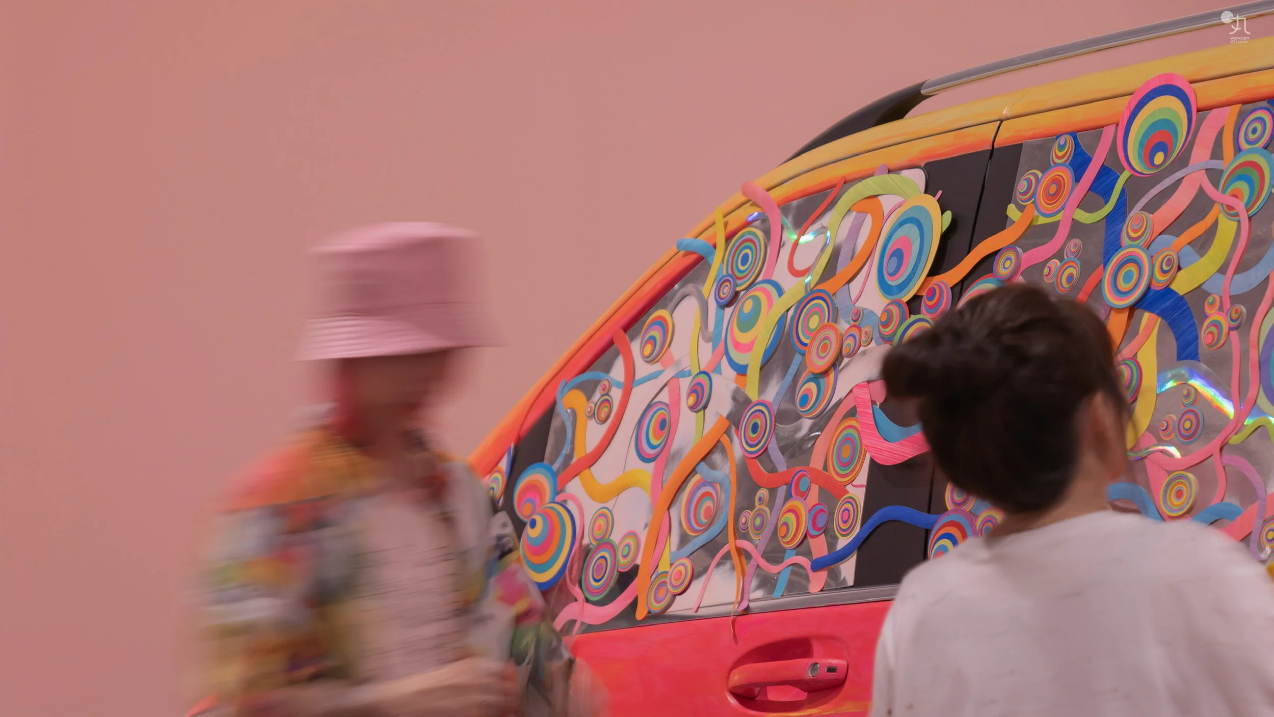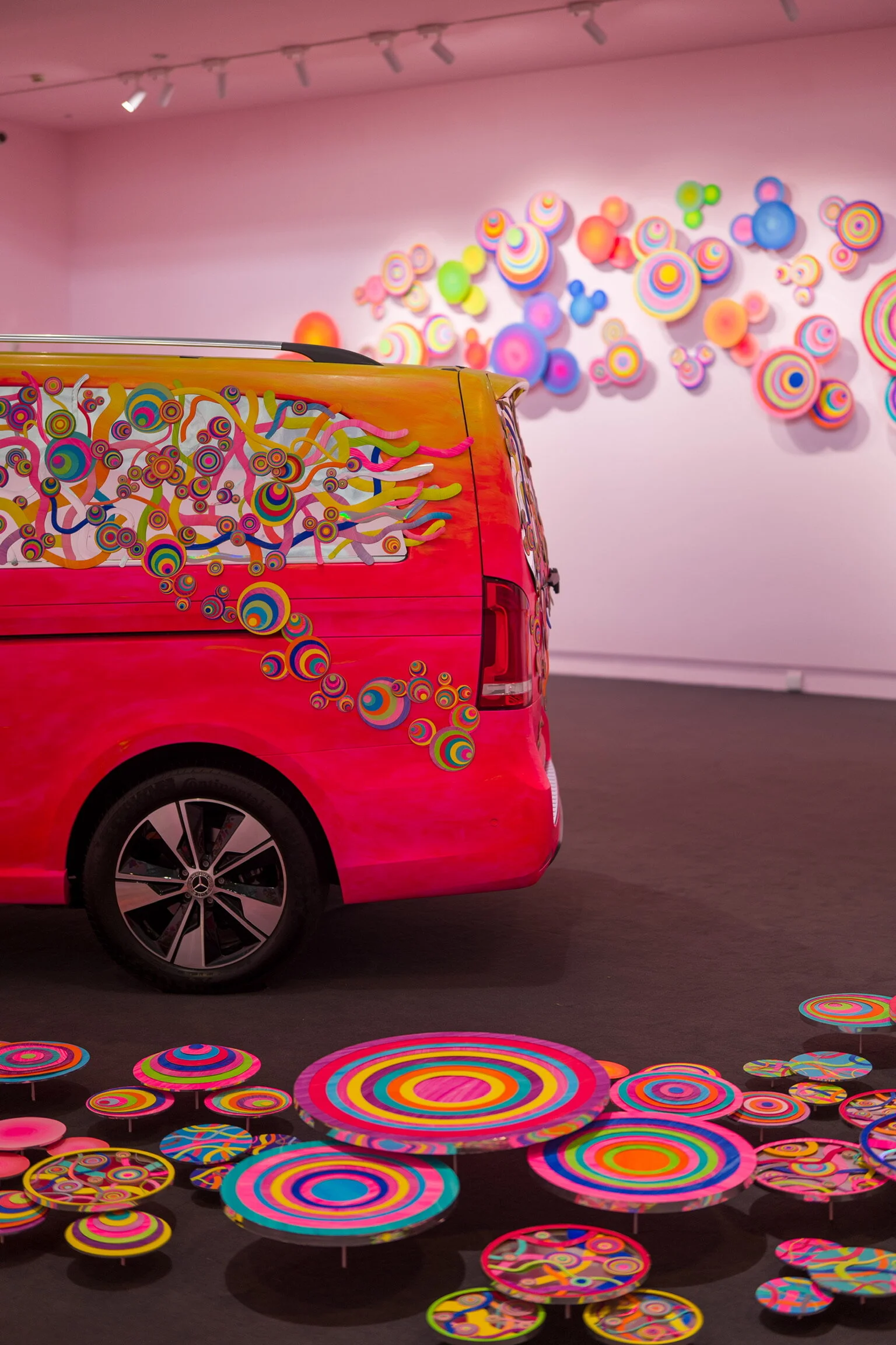 车身被粉色颜料热烈覆盖,满载密集圆圈,一路散播为宽广而不受限的路径。