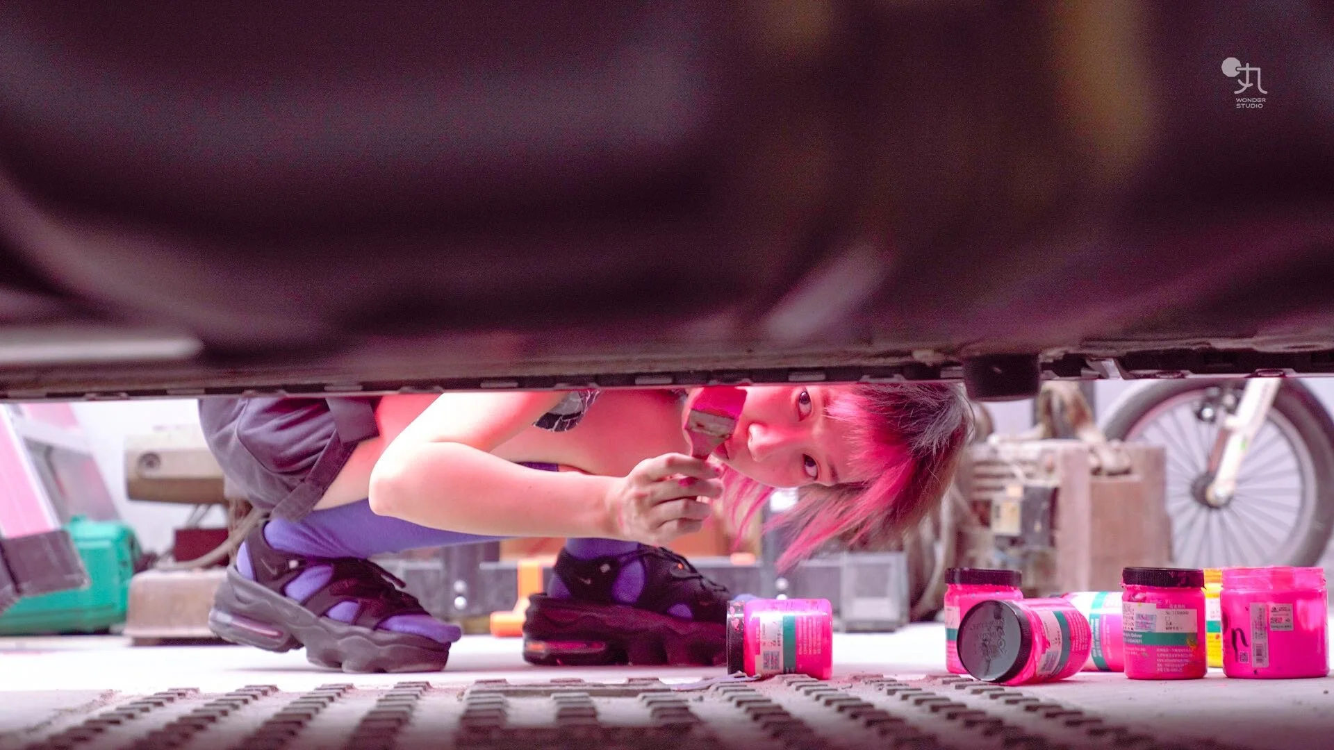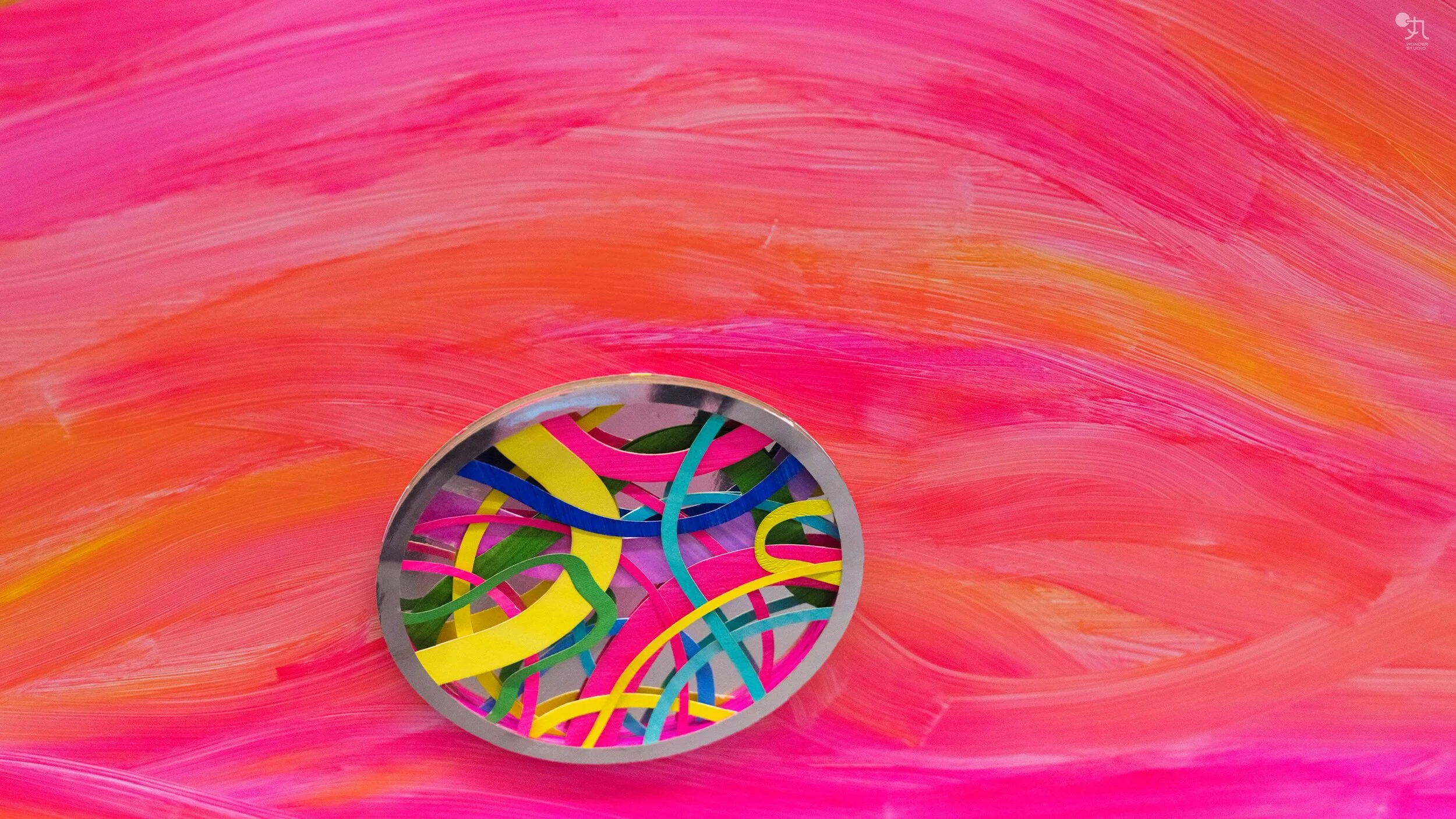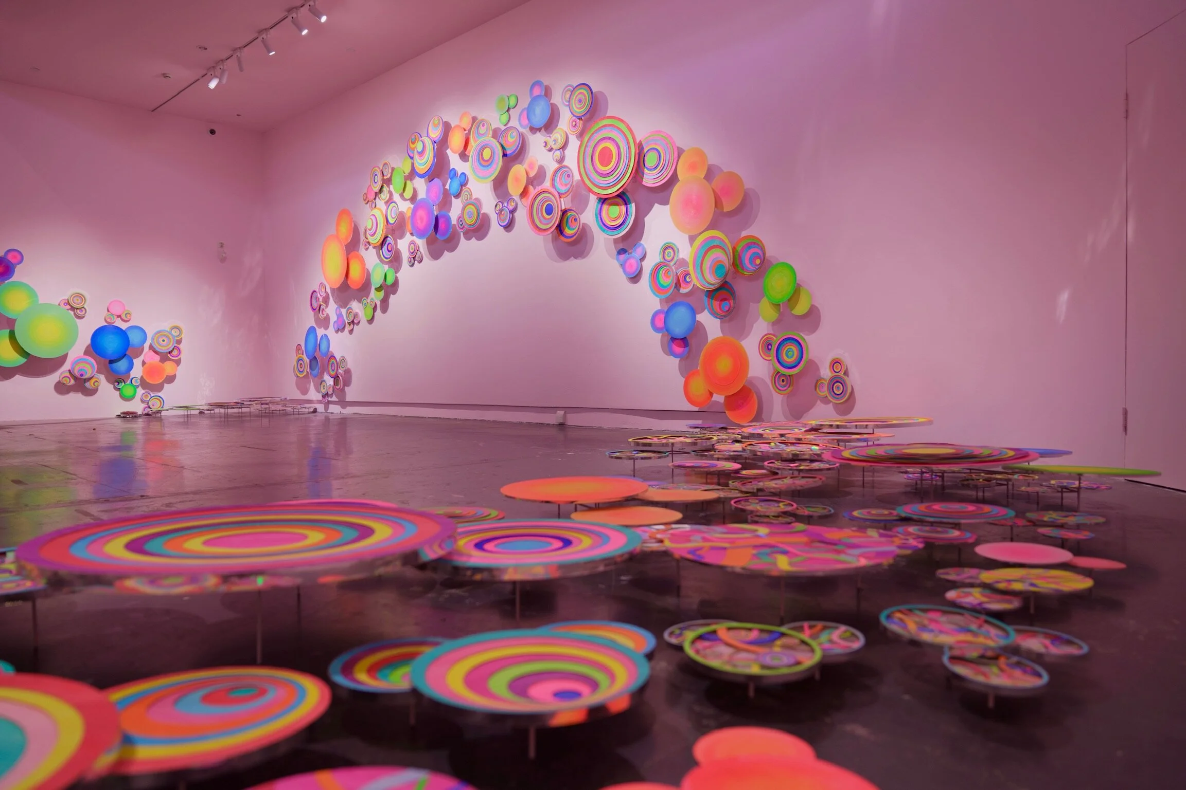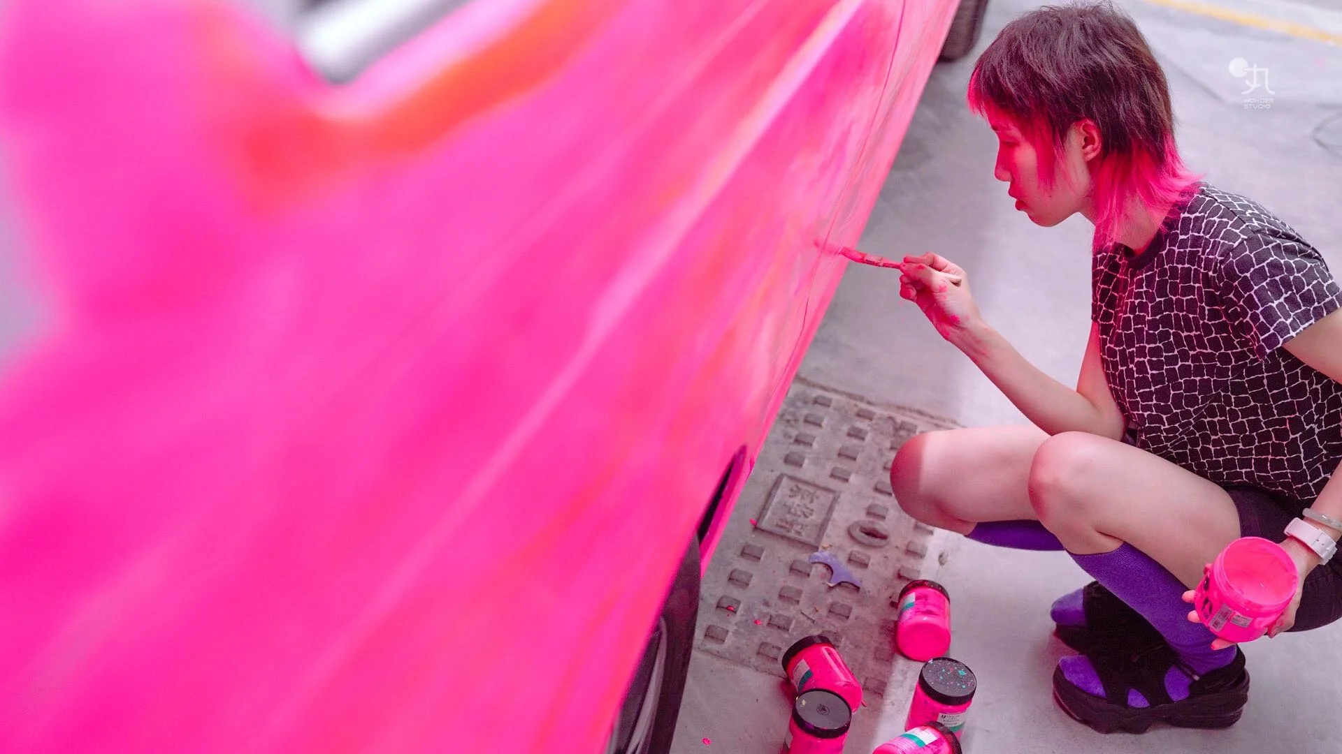 车身被粉色颜料热烈覆盖,满载密集圆圈,一路散播为宽广而不受限的路径。