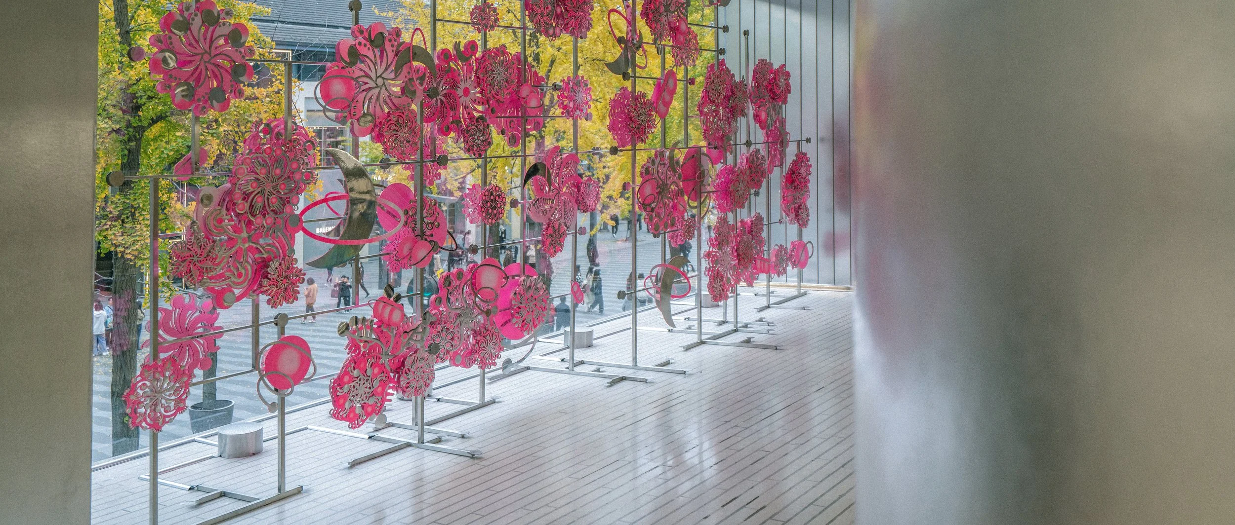 作品正首次展出于黑洞杭州店、广州北京路店内,位于西湖畔的平海路上。它占据二楼的整面橱窗,却以正面朝内,背对着窗外的行人, 破除些许原本橱窗功能的“美陈”感。欢迎前往与这个虚空的宇宙平面,在等高的水平角度目遇相视。