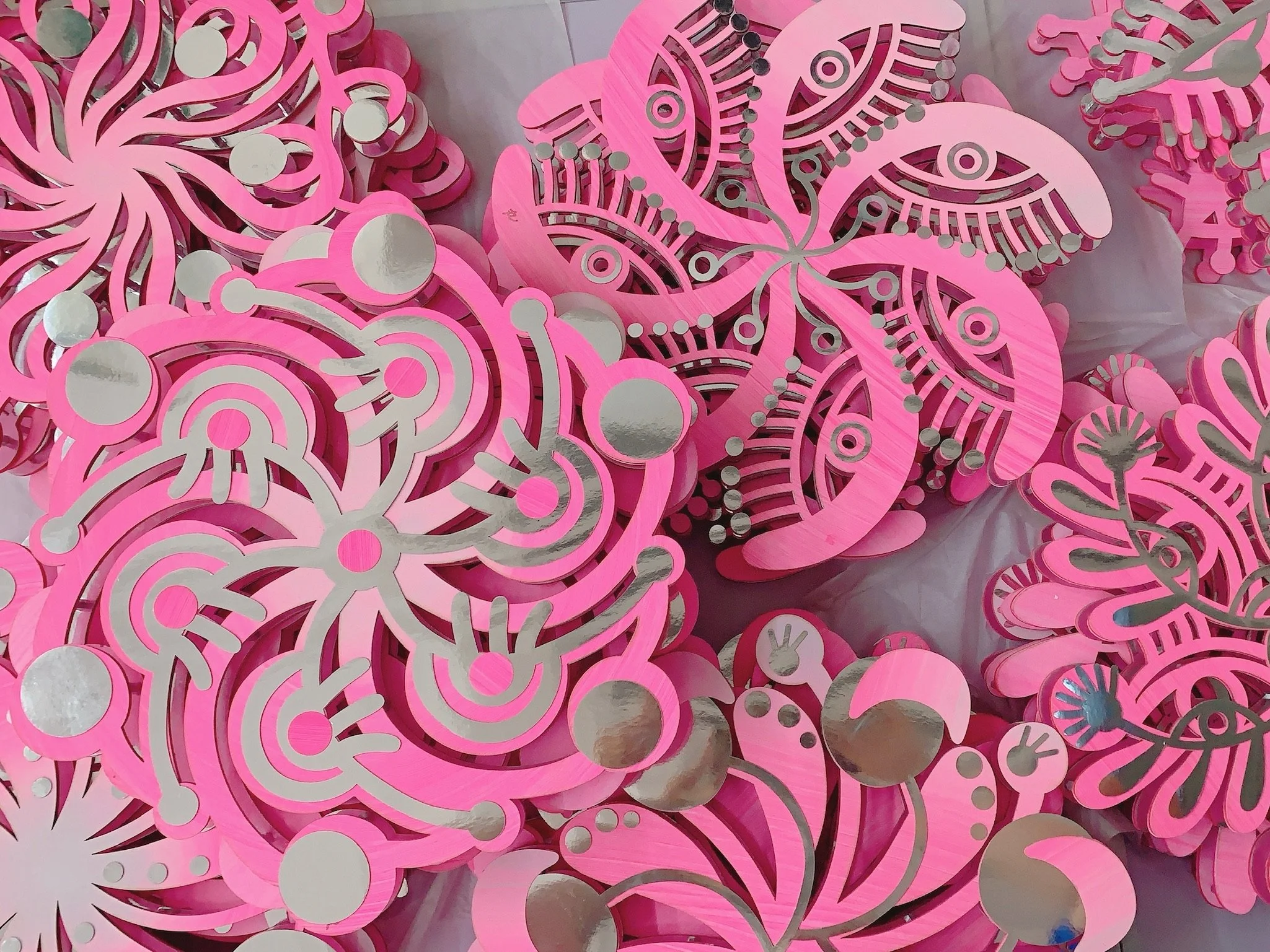 《垂直乾坤》是粉丸历件作品中运用零件最多的一件。由零到整、静至动,历时3个月,将近300个图腾、9000个金属零件,通过反复而精确的工序和组合,得以让她心目中所勾勒的宇宙在“正面”垂直、令乾坤扭转。