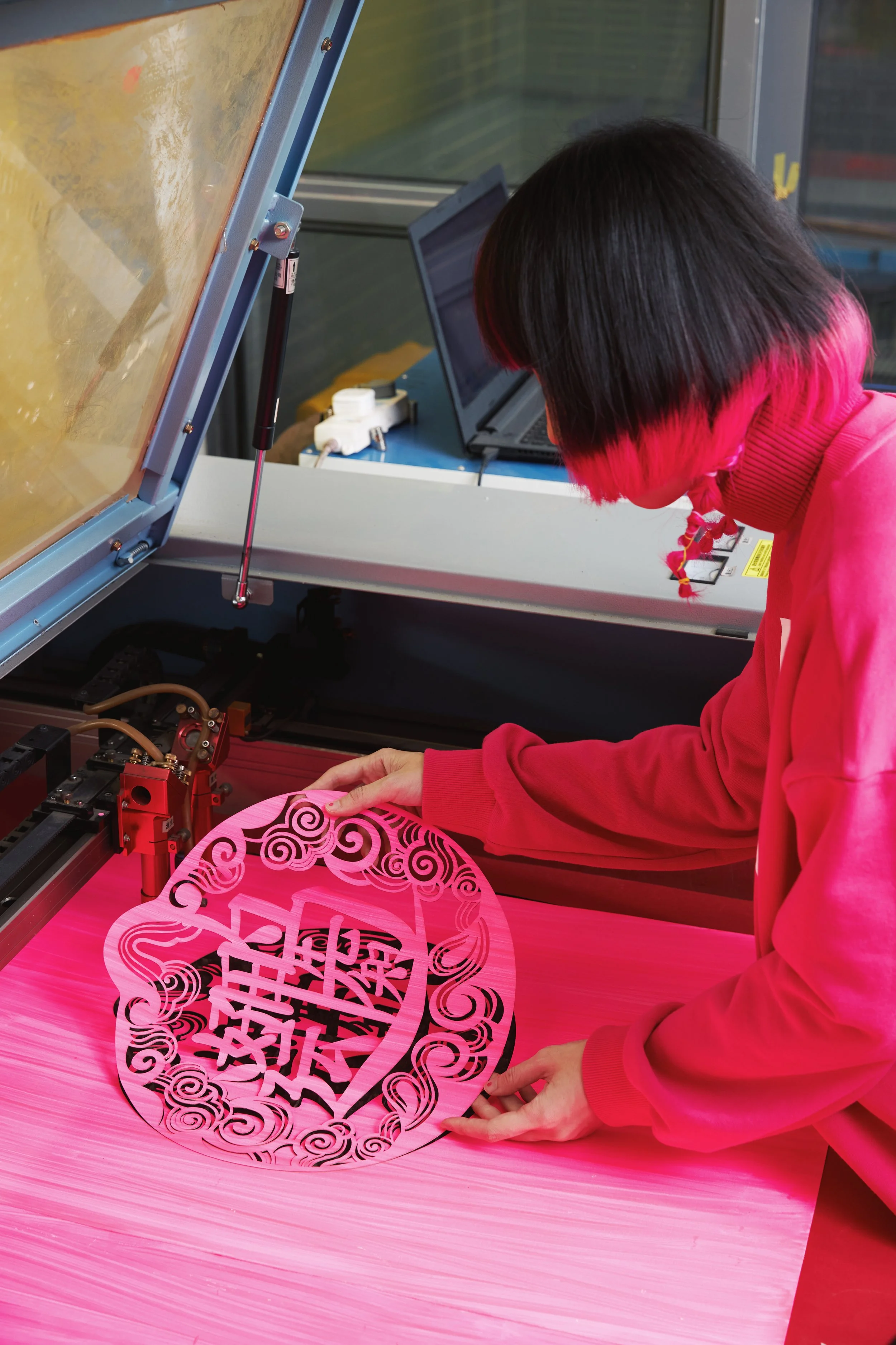 粉丸常常强调自己会以当代人的角度来看待和使用剪纸。从她的作品中总是透露着关于颜色与镂空方案的审美集体性,可她当然也从中尝试制造新的感官经验,那些来自当下和日常的影响,组合成了她的表达冲动。