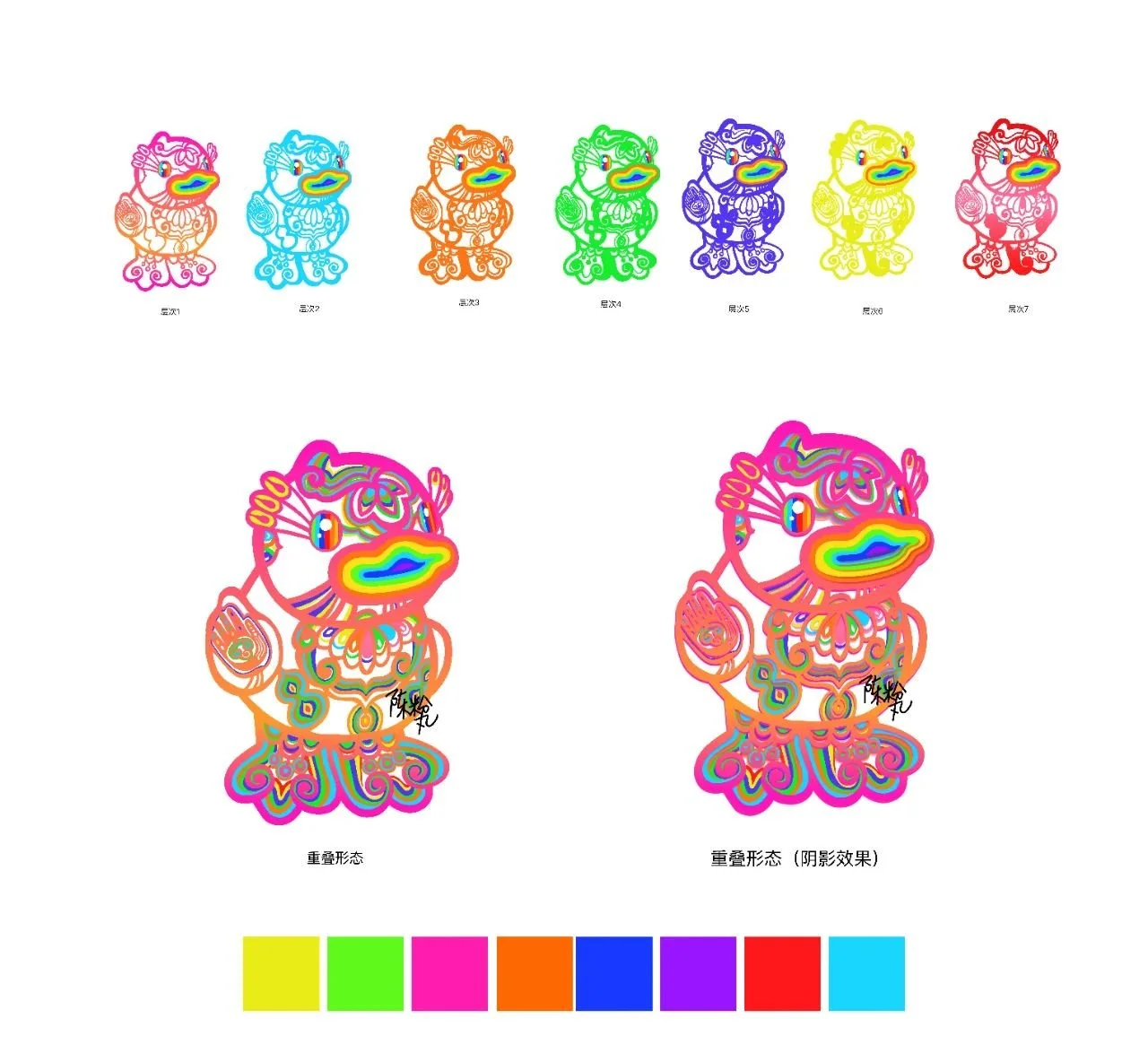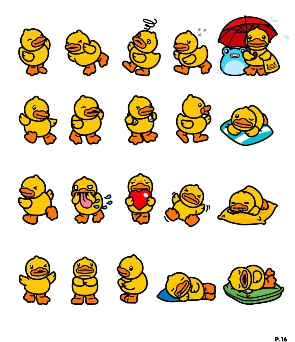 右为小黄鸭原有经典形象对比 (部分,由品牌提供) ; 左为粉丸手稿,小黄鸭联名形象分层解析。(未经允许请勿取用)