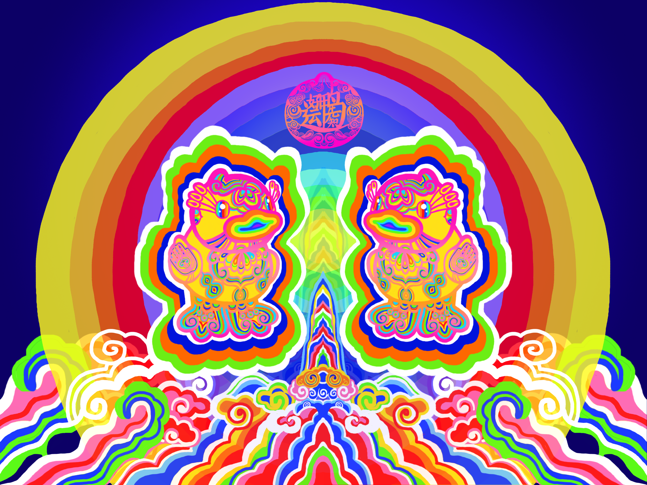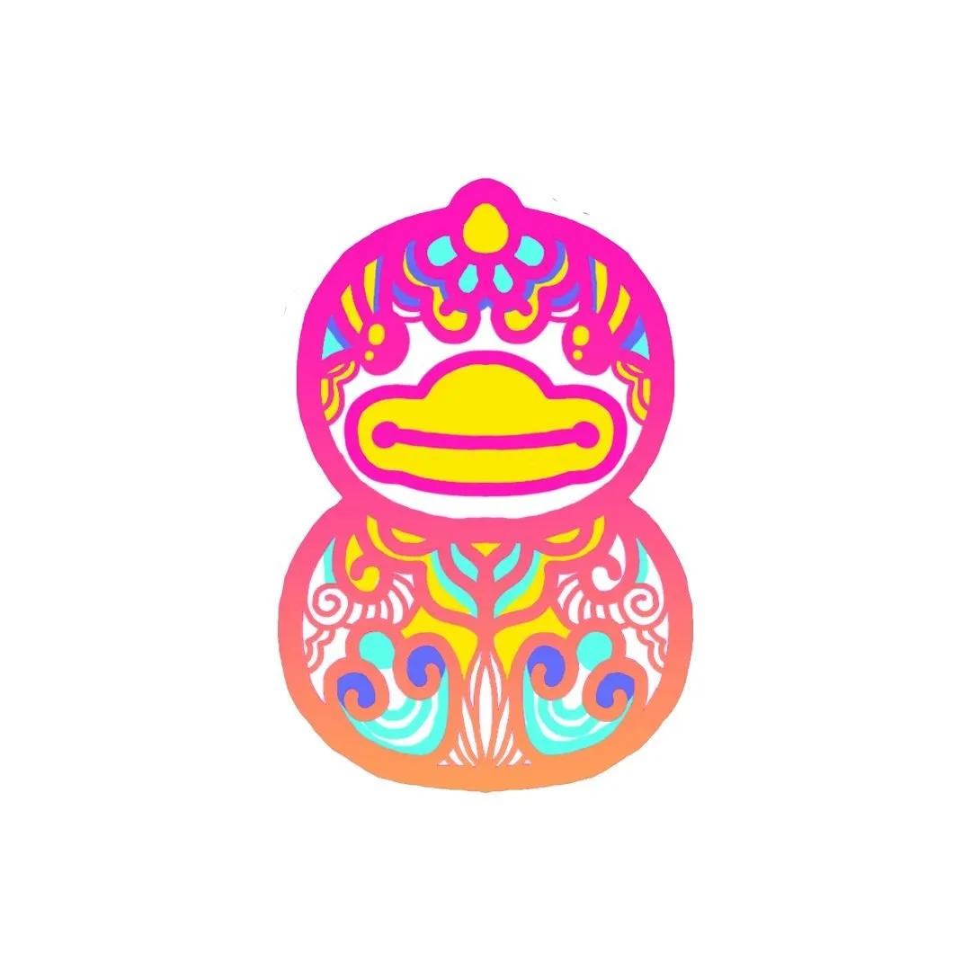 如何在提取原有形态辨识度的同时,融入剪纸“外衣”造型,是粉丸最为关注的课题。小黄鸭标志性的头部尖尖、眼神中的亮光与头身比被保留,但特别之处是,它的新眼睫毛来自于粉丸的代表作之一 —— 大型空间作品《不息》中,龙头眼部的剪纸造型;而翅膀则化身为「手掌」,这种曾被多次使用、于粉丸而言意味着爱的元素。鸭身佩戴着祥云、葫芦等传统东方意象,色彩却更为鲜艳和颠覆。