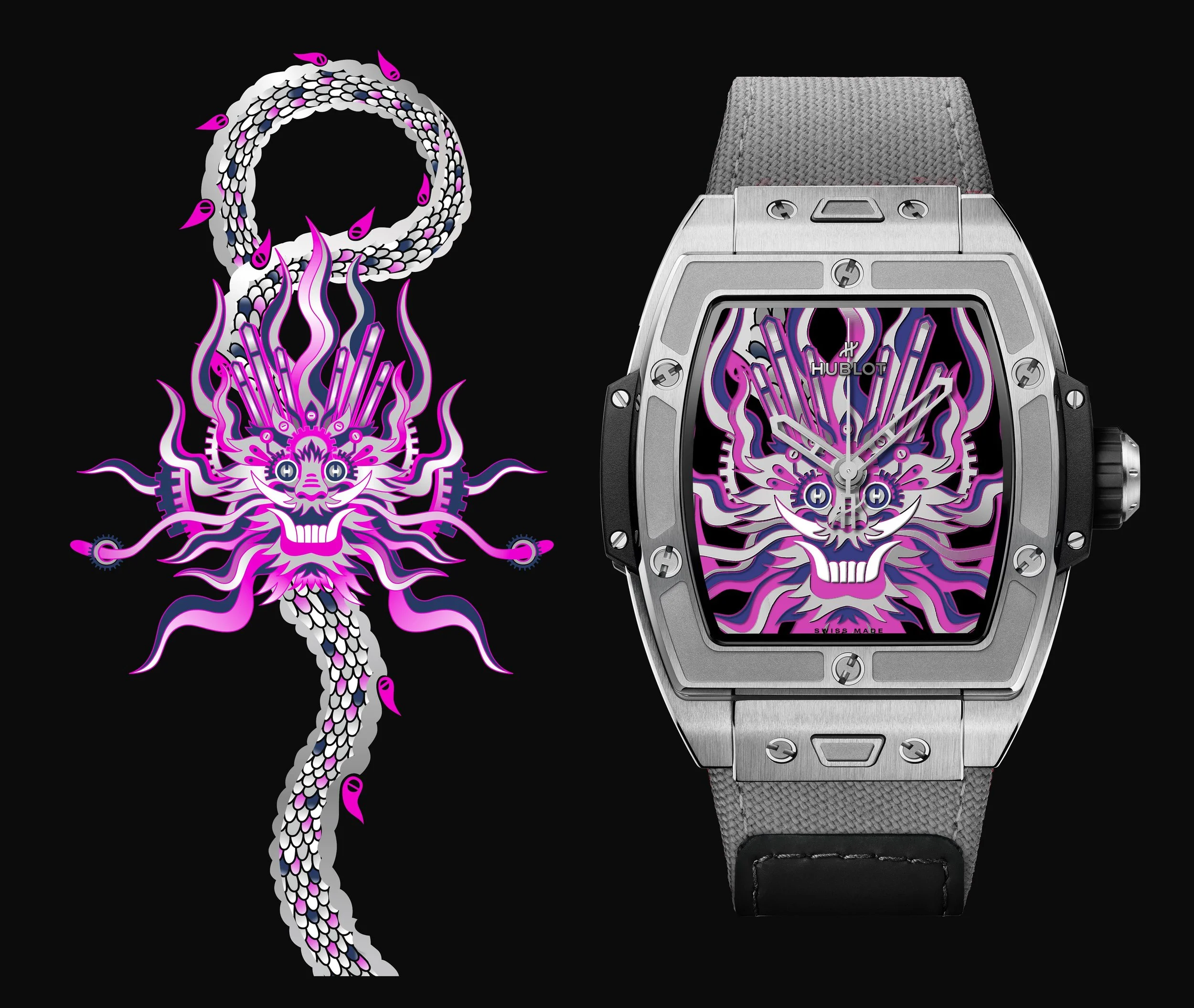 合作之初,粉丸首先结合时间的概念,将代表作《不息》 进行革新,把齿轮元素作为龙首的一部分。而它层层叠叠的结构和纤长延伸的形态皆与腕表不谋而合:这款联名腕表在表盘内通过指针、齿轮、螺丝的层叠镶嵌设计,巧妙呼应原作品的剪纸拼贴及浮雕技艺;表带则结合品牌的融合性材质特点,将无尽的彩色龙鳞悉数纳入。