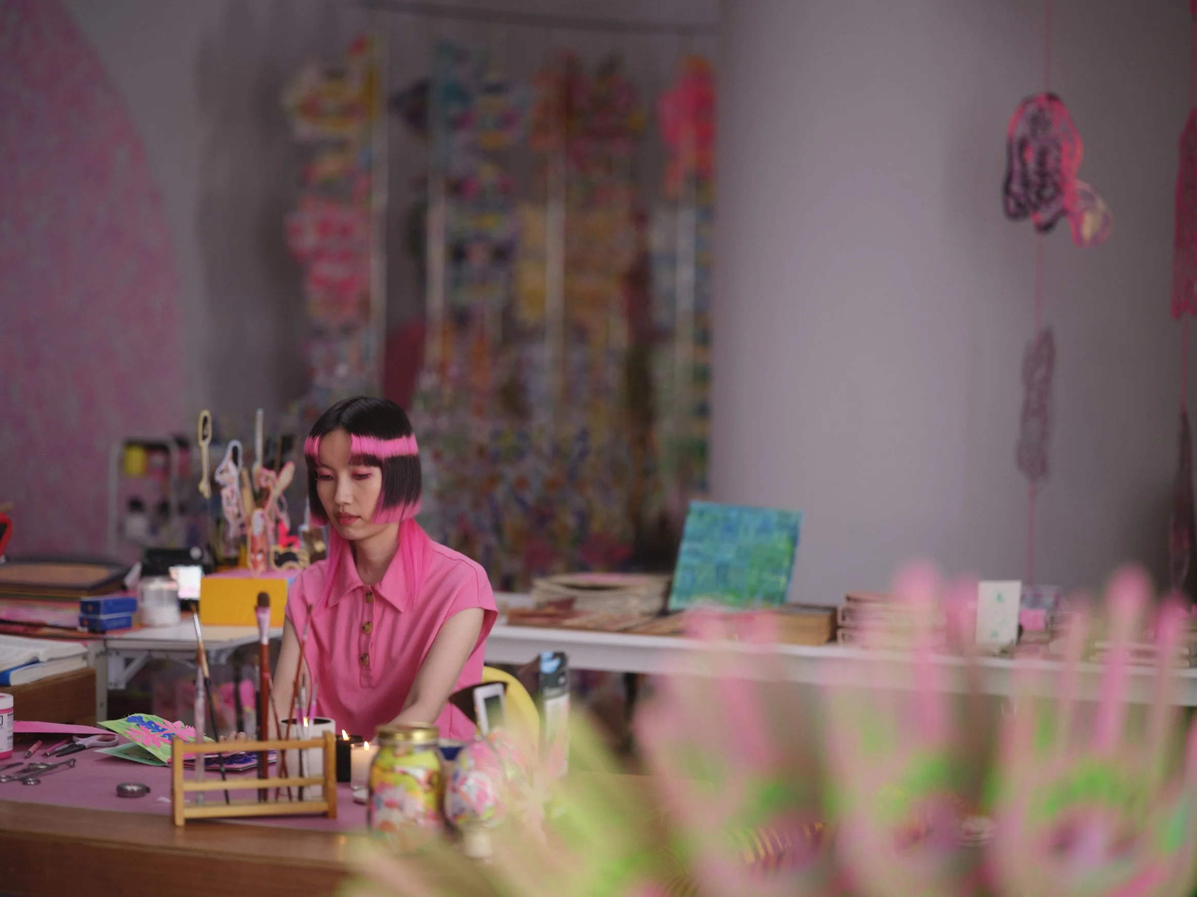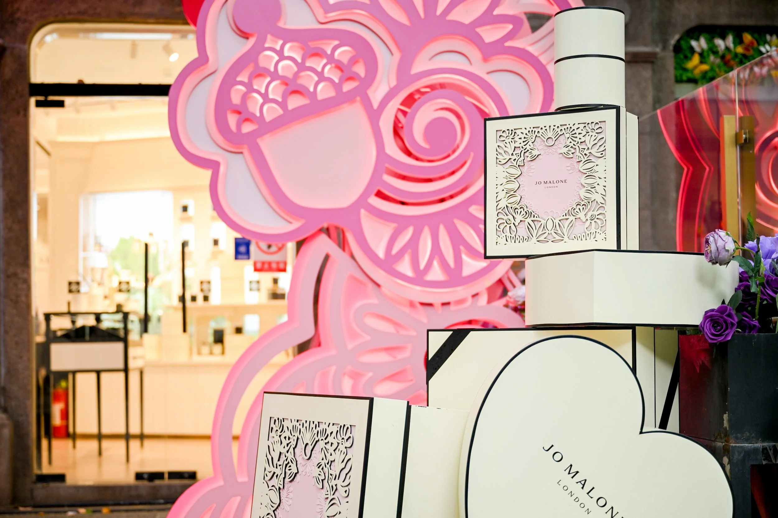 联名品牌祖玛珑(JO MALONE),粉丸将枝条的摇摆、洋流的舞动剪裁进纸张镂空之处,鲜花纷呈,以呼应香氛带给她的想象世界。此次创作的装置作品限时坐落于上海新天地店,与同系列礼盒共同呈现。