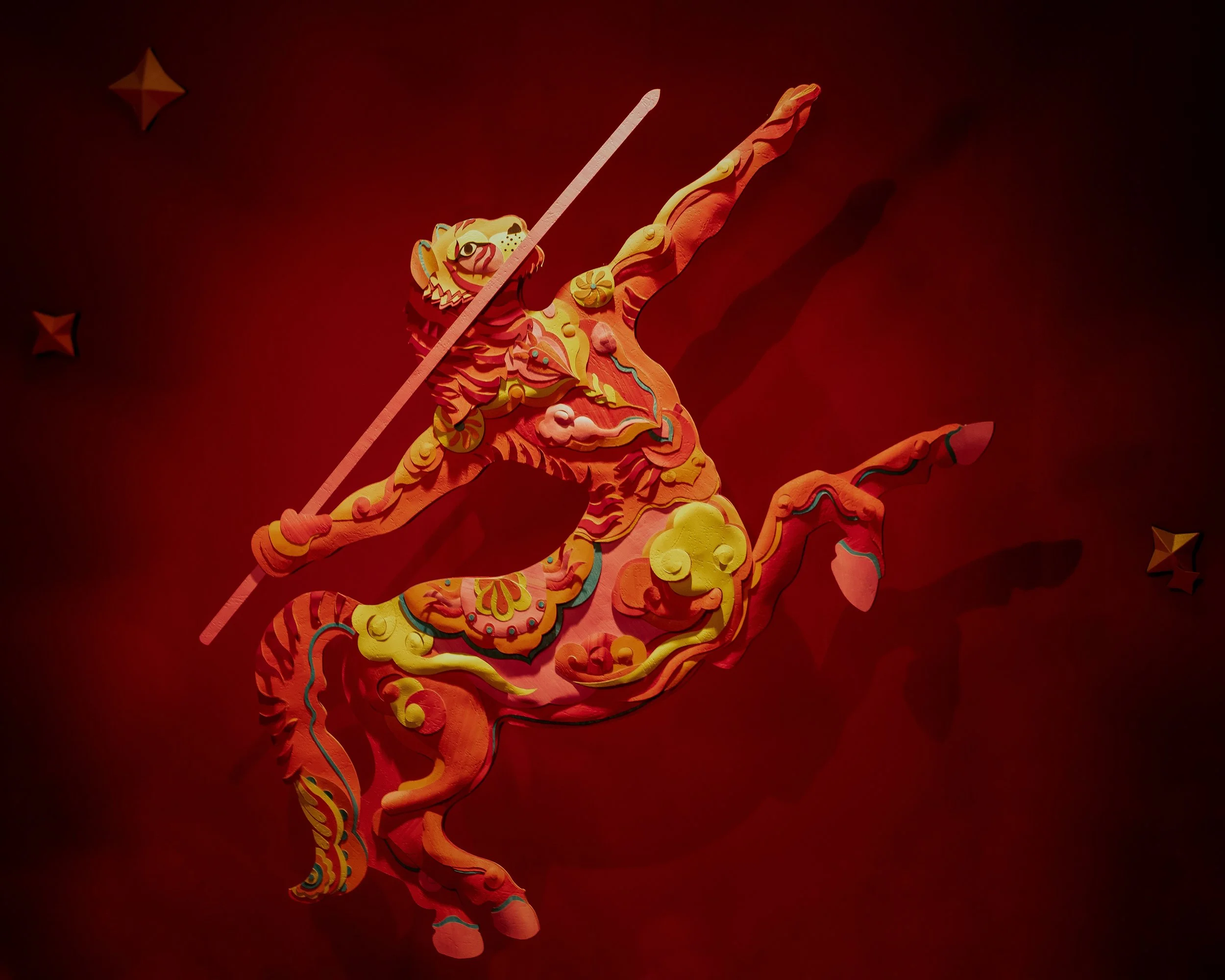 In the collaboration with Remy Martin, Fenwan combines the two unrelated elements of "horse" and "tiger" with paper, giving a new meaning to "sloppy" at the beginning of the New Year -- the definition of an artist!