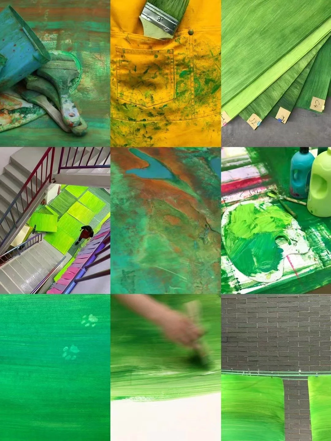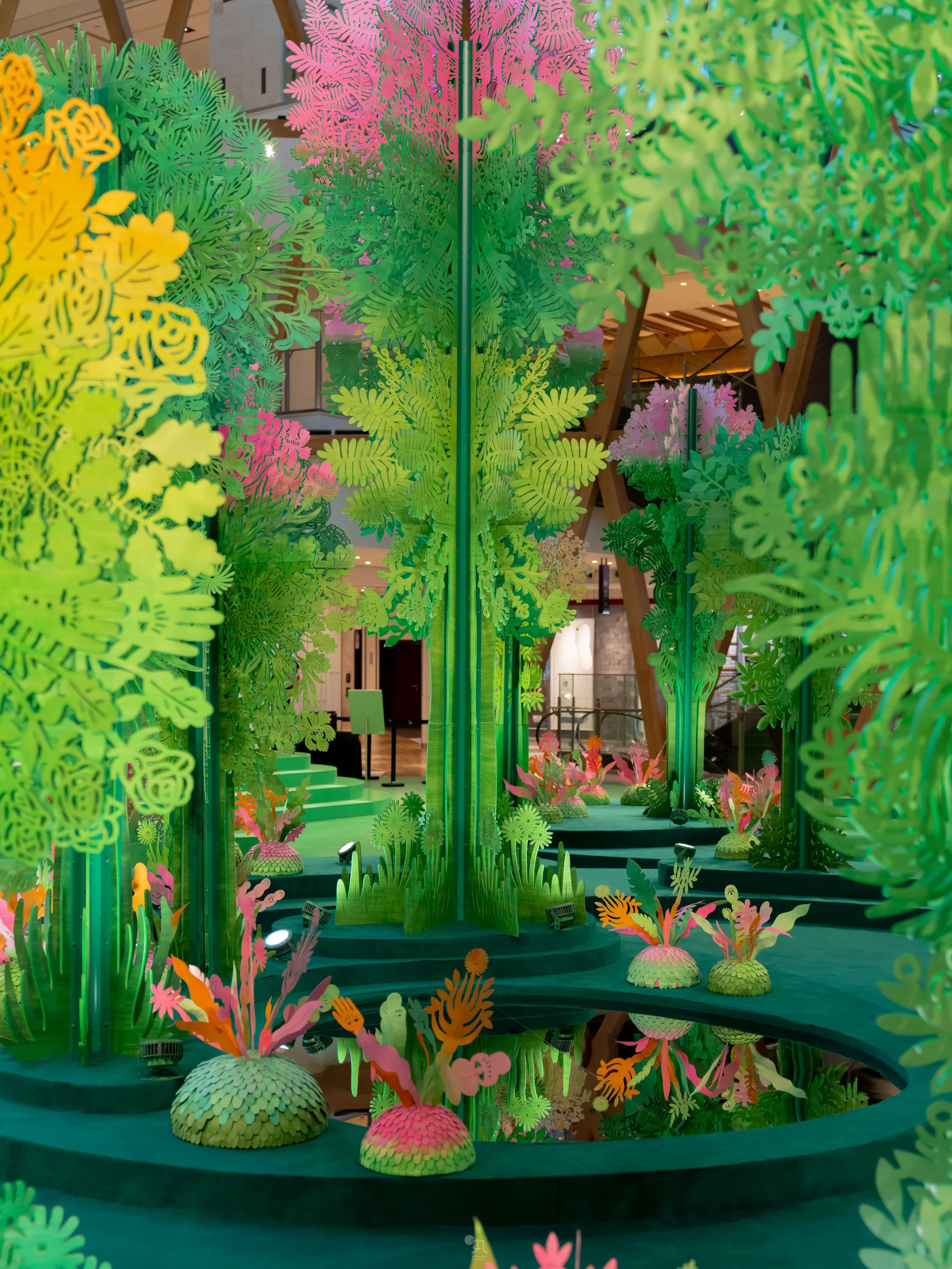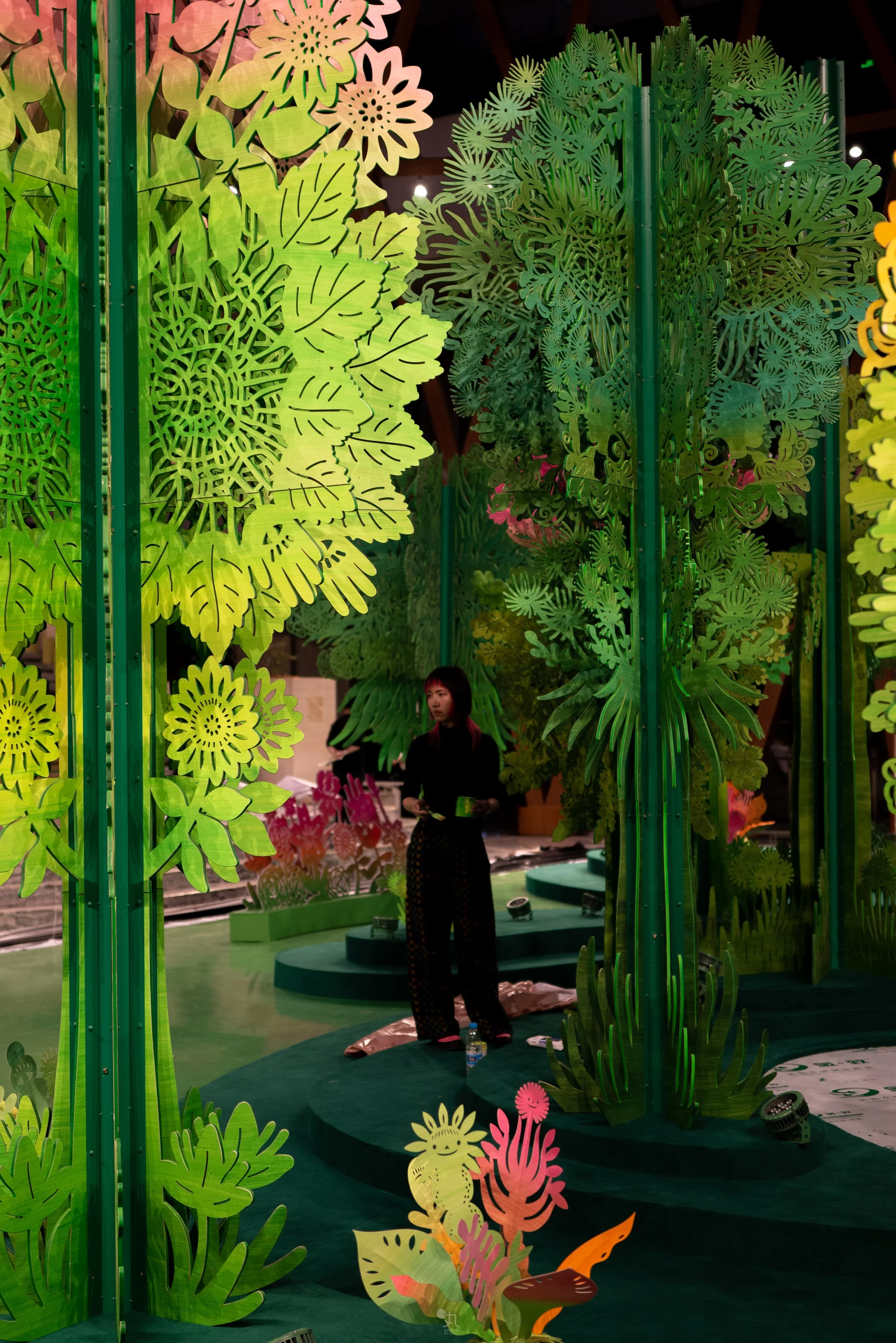 作品使用超过1200张环保纸,经由手工着色呈现而每张各不相同,因此对应着无数的绿与粉色。这像是一种取于自然又模仿自然的往复对称,这种对称是通过创作、手工和科技工艺而主动实现的。