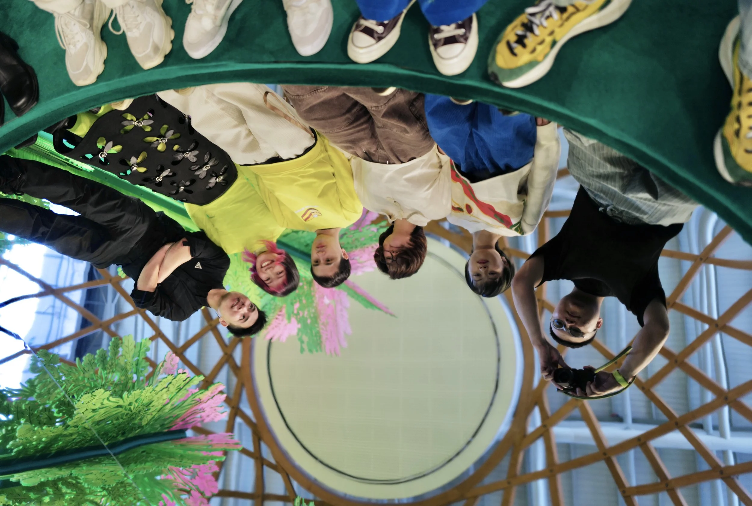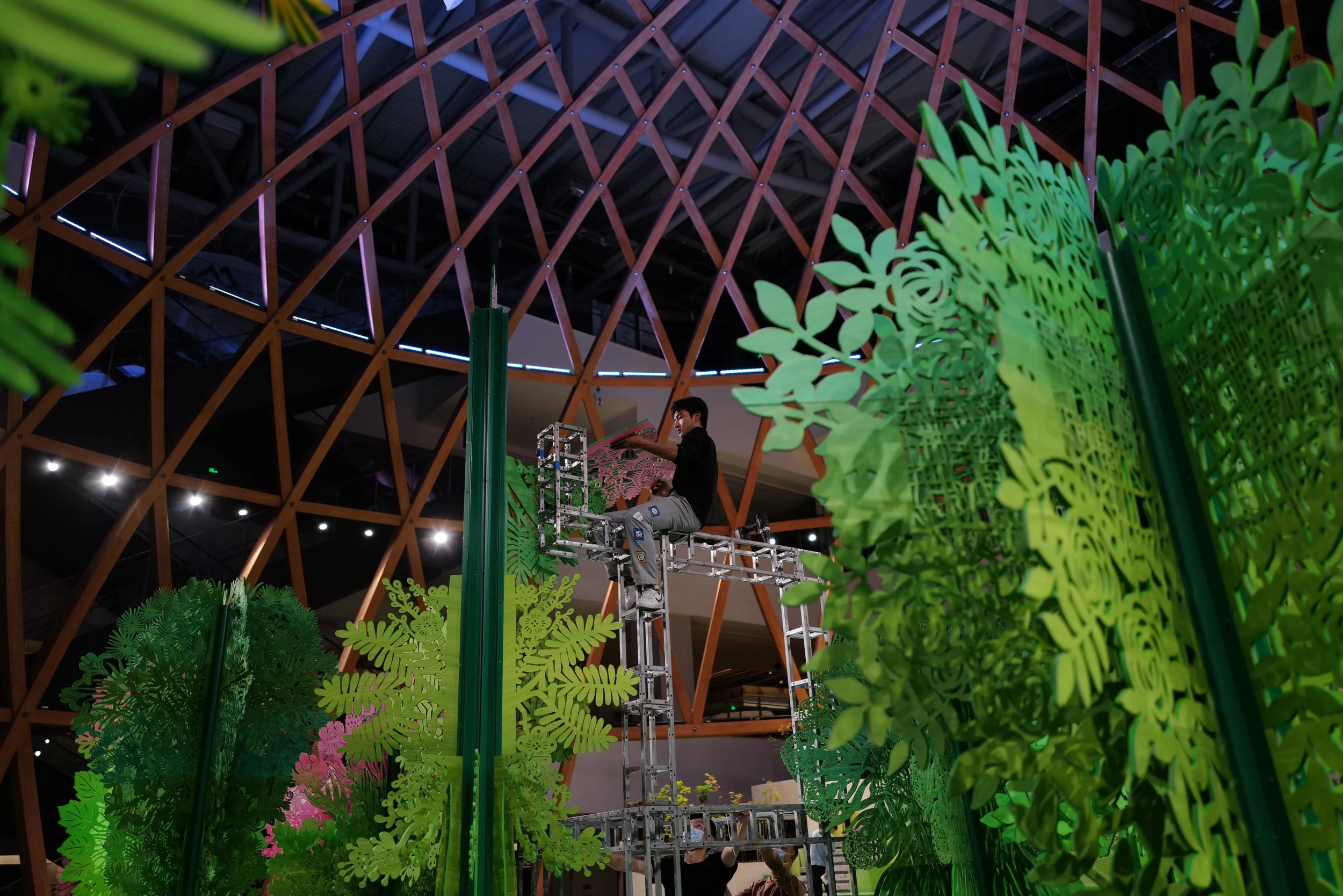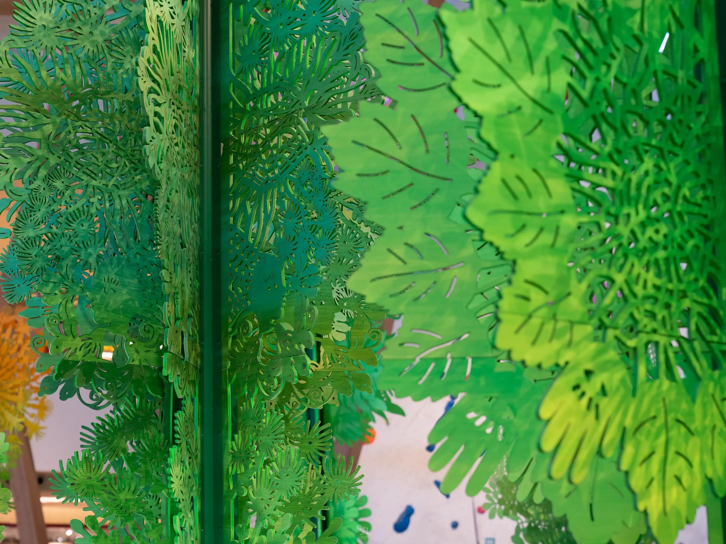 作品使用超过1200张环保纸,经由手工着色呈现而每张各不相同,因此对应着无数的绿与粉色。这像是一种取于自然又模仿自然的往复对称,这种对称是通过创作、手工和科技工艺而主动实现的。