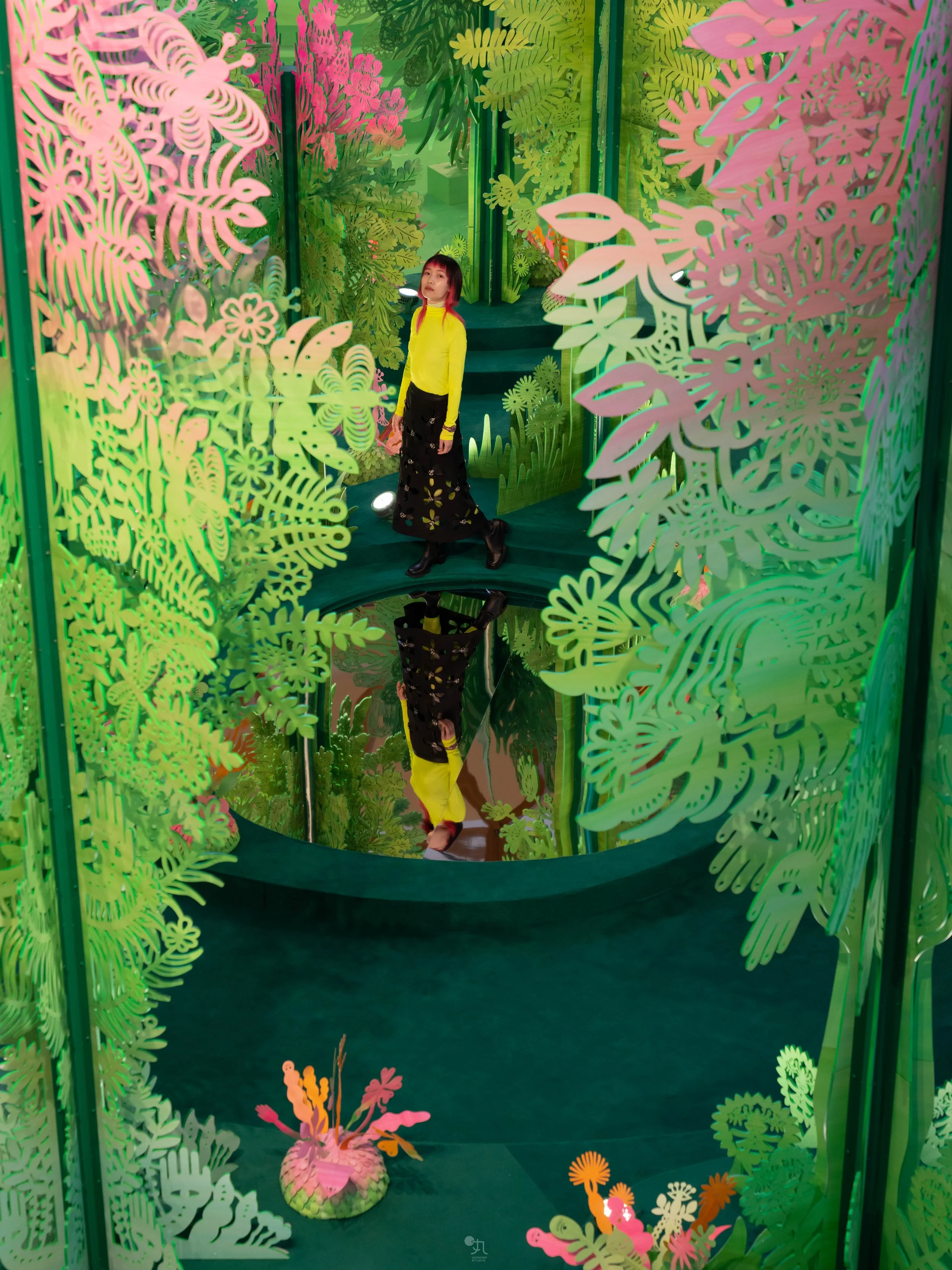 For the first time in this artwork series, landscape of mirror appear. It looks like the middle of a lake to make plants of different heights symmetrical with themselves . The “lake“ also reflects the canopy above and the wooden beam structure at the top of the space, absorbing different views from different angles.